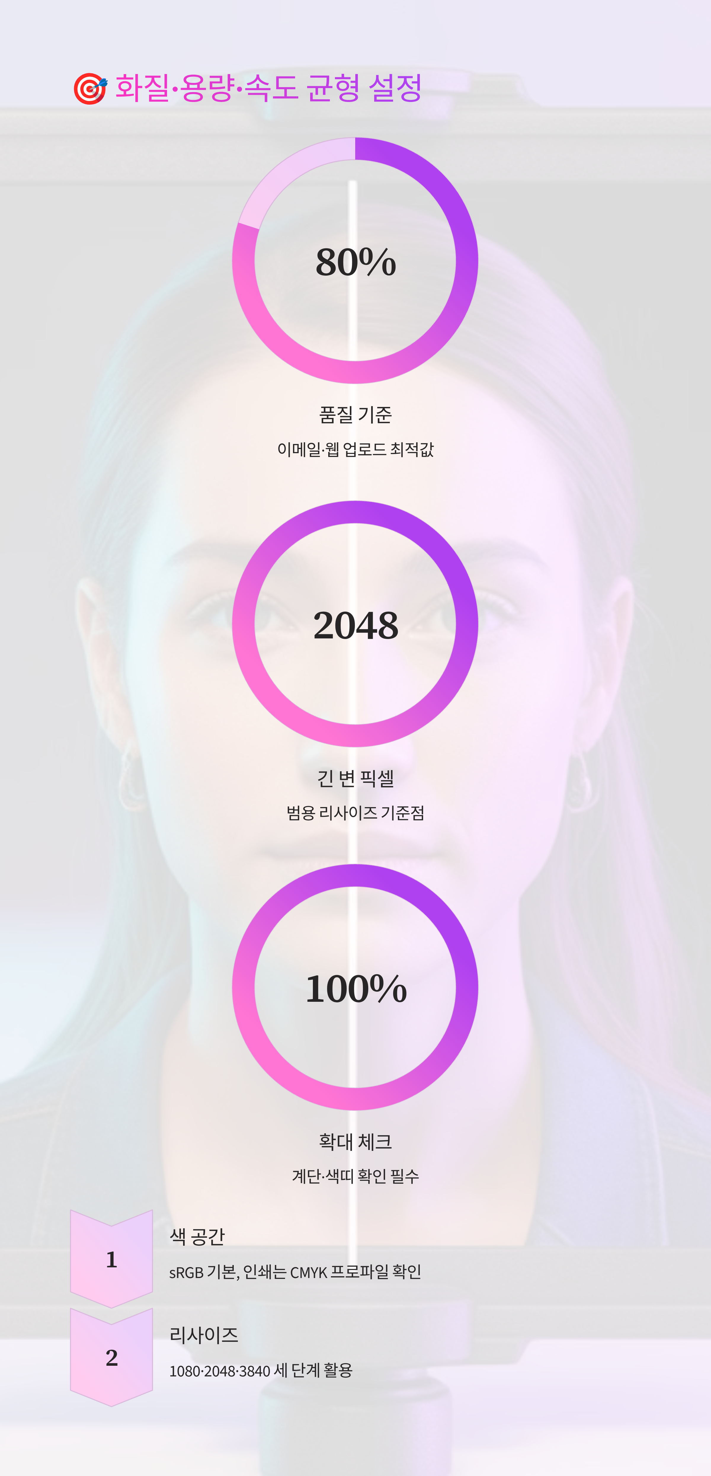 화질은 프리뷰 100% 확대에서 피부·하늘·그라데이션을 봐요. 계단이나 색띠가 보이면 품질을 한 칸 올리고, 텍스트 주변이 무너지면 샤프닝을 살짝 줄이는 게 좋아요. 용량은 이메일이나 웹 업로드 한도에 맞춰 긴 변/파일 크기 제한을 같이 쓰면 실수가 줄어요.