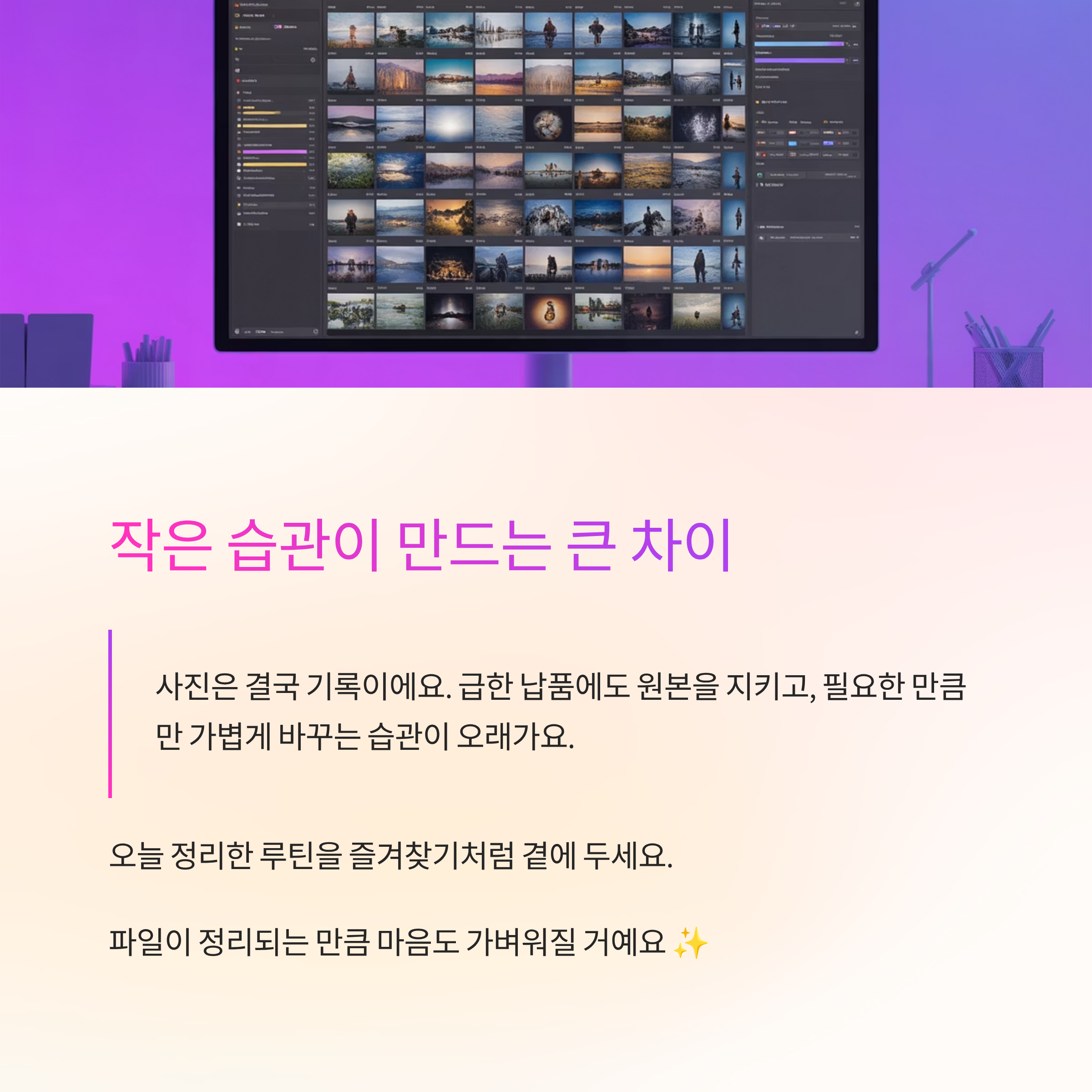 사진은 결국 기록이잖아요. 급한 납품에도 소중한 원본을 지키고, 필요한 만큼만 가볍게 바꾸는 습관이 오래가더라고요. 오늘 정리한 루틴을 즐겨찾기처럼 곁에 두고, 다음에 또 막히면 체크리스트부터 훑어보세요. 생각보다 간단하게 풀리는 순간이 금방 와요. 파일이 정리되는 만큼 마음도 가벼워질 거예요. 그 리듬만 잃지 않게, 작은 규칙을 계속 이어가면 충분해요.