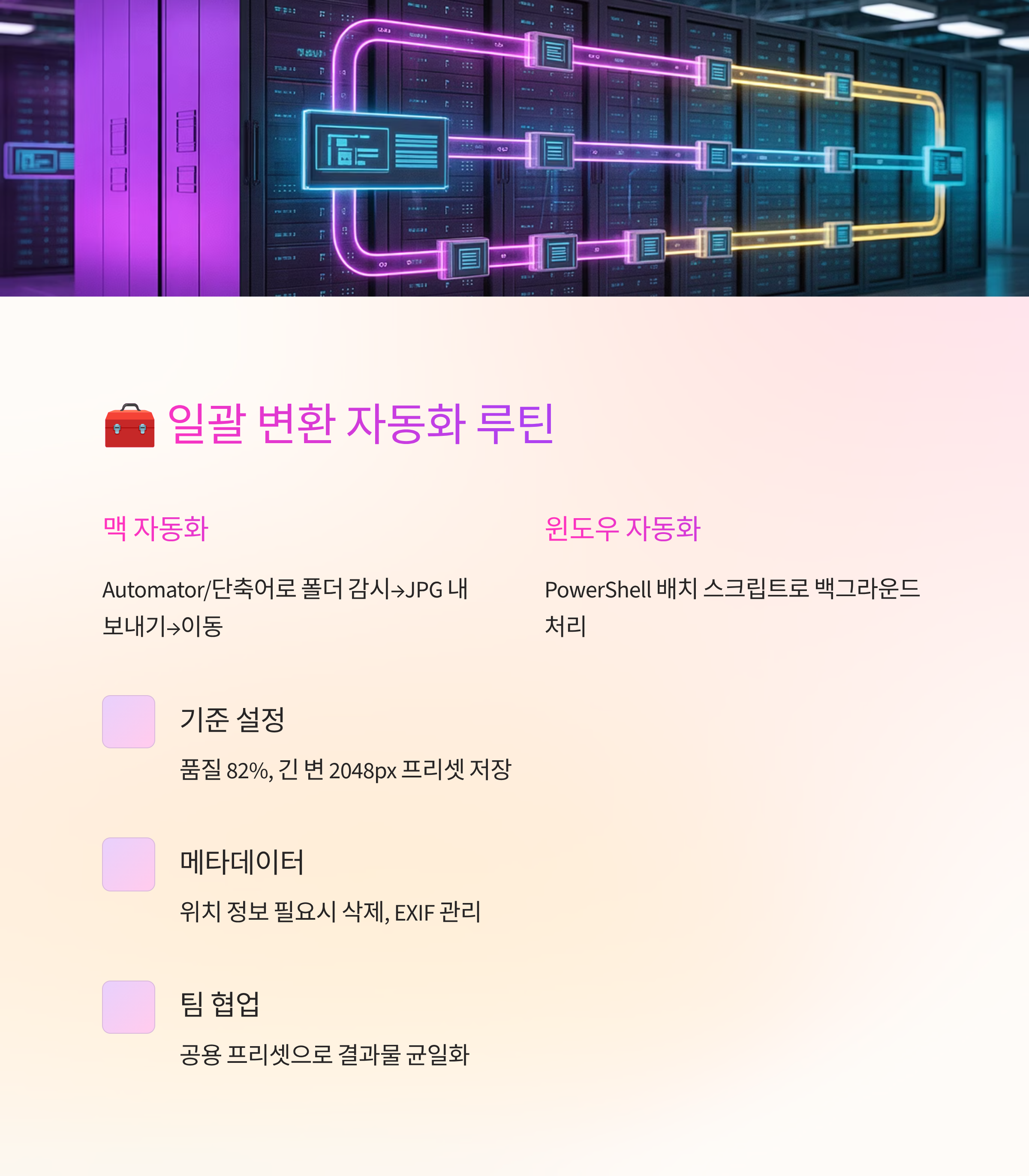 반복 작업이 많다면 로컬 툴을 쓰는 게 편해요. 맥은 Automator/단축어, 윈도우는 PowerShell이나 배치 스크립트로 폴더 감시→JPG 내보내기→완료 폴더 이동까지 이어 붙이면 손이 거의 안 가요. 여기서 품질 82%, 긴 변 2048px 같은 기준을 정해두면 어떤 프로젝트든 바로 써먹기 좋아요. 트리거만 눌러두면 HEICJPG변환이 백그라운드처럼 처리돼서 스트레스가 확 줄어요.