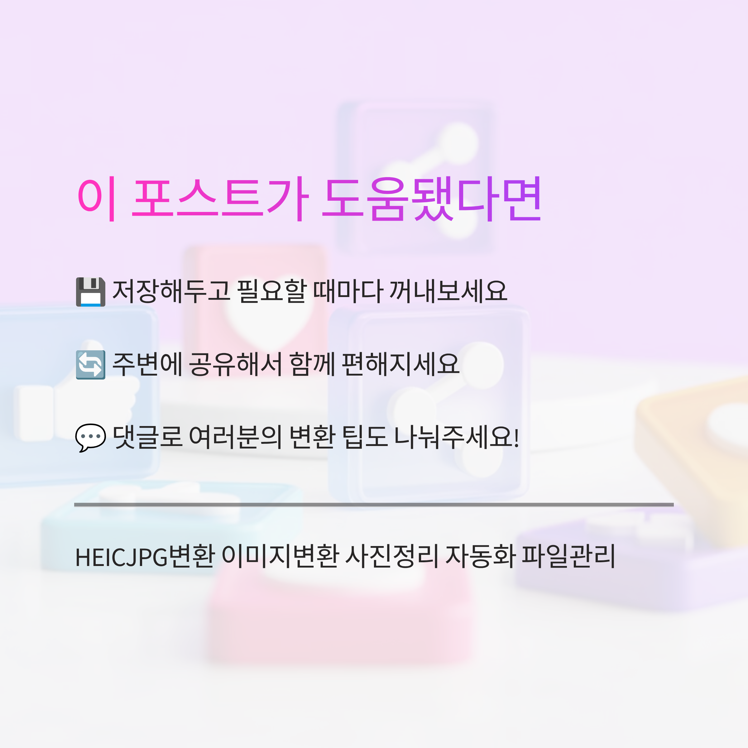 급한 제출, 웹 업로드, 구형 뷰어 호환이 필요할 때는 HEICJPG변환을 바로 적용해도 좋아요. 반대로 원본 보관이나 색 보정이 많다면 HEIC로 저장해 두고, 납품본만 JPG로 따로 내보내는 방식이 안전하더라고요. 핵심은 용도를 먼저 정하고 변환 품질을 그에 맞추는 거예요. 인화용은 고품질·저압축, 웹·이메일은 중간 품질에 리사이즈를 얹으면 충분해요.