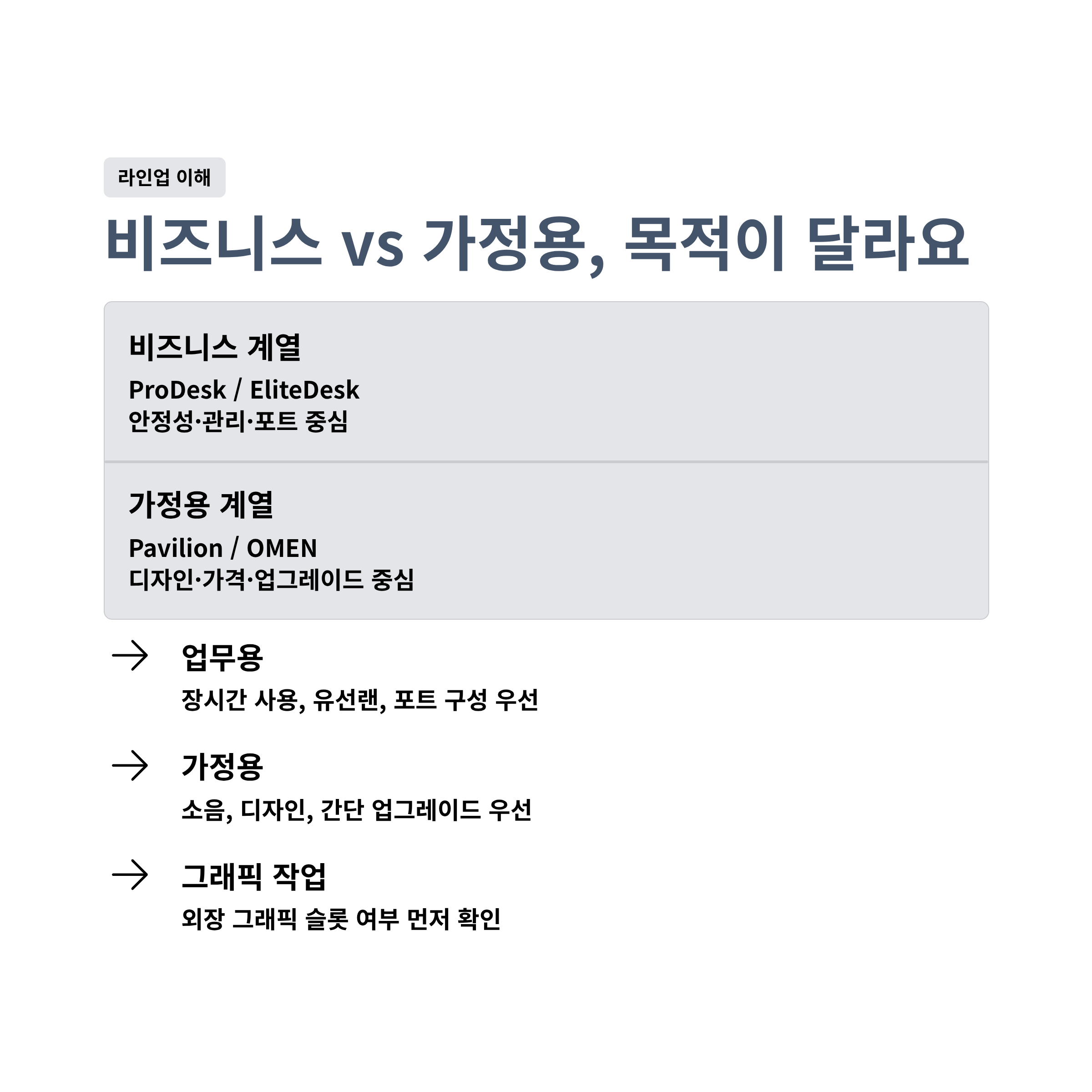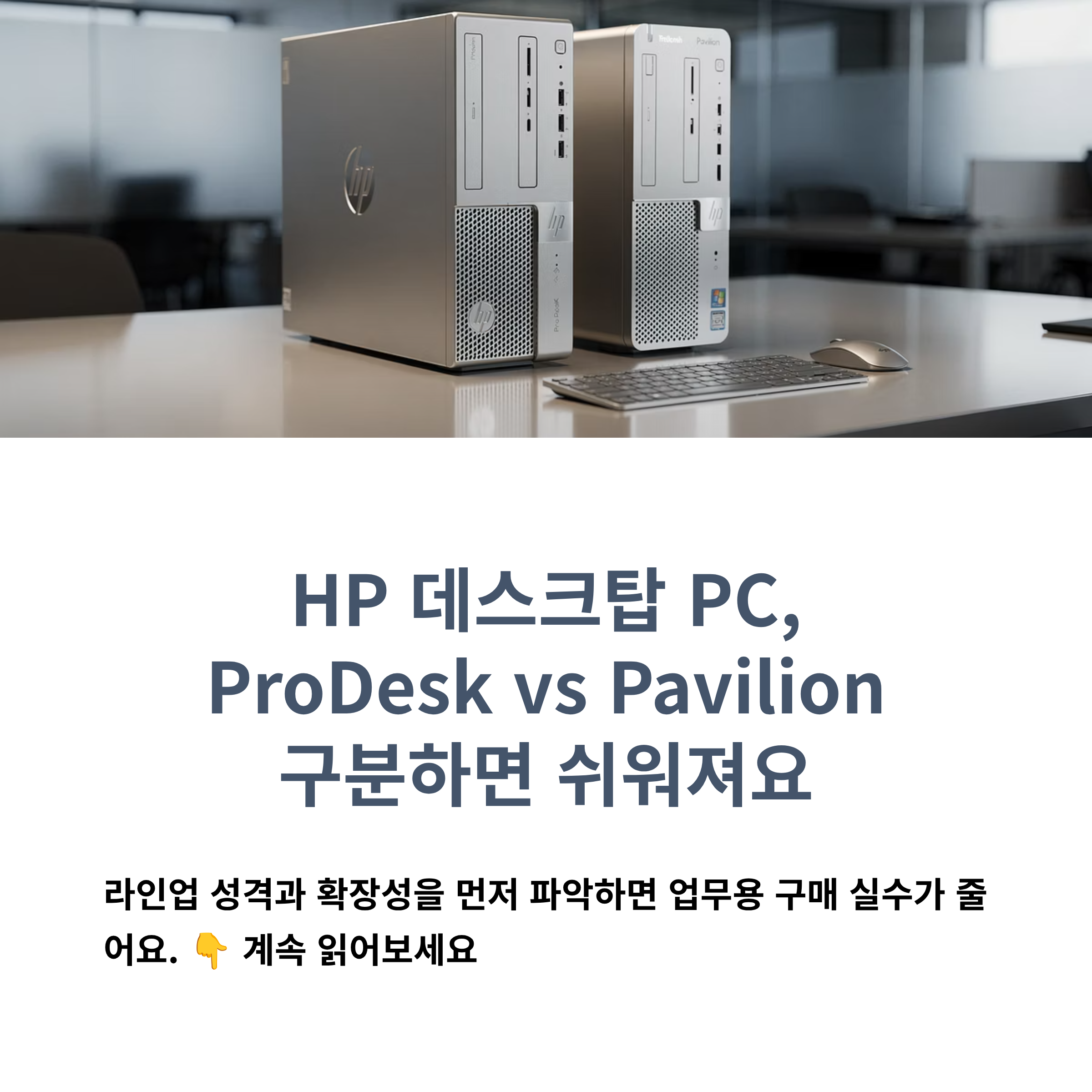 HP 데스크탑은 크게 ProDesk/EliteDesk 같은 비즈니스 계열과, Pavilion/OMEN 같은 소비자 계열로 성격이 나뉘는 편이에요.