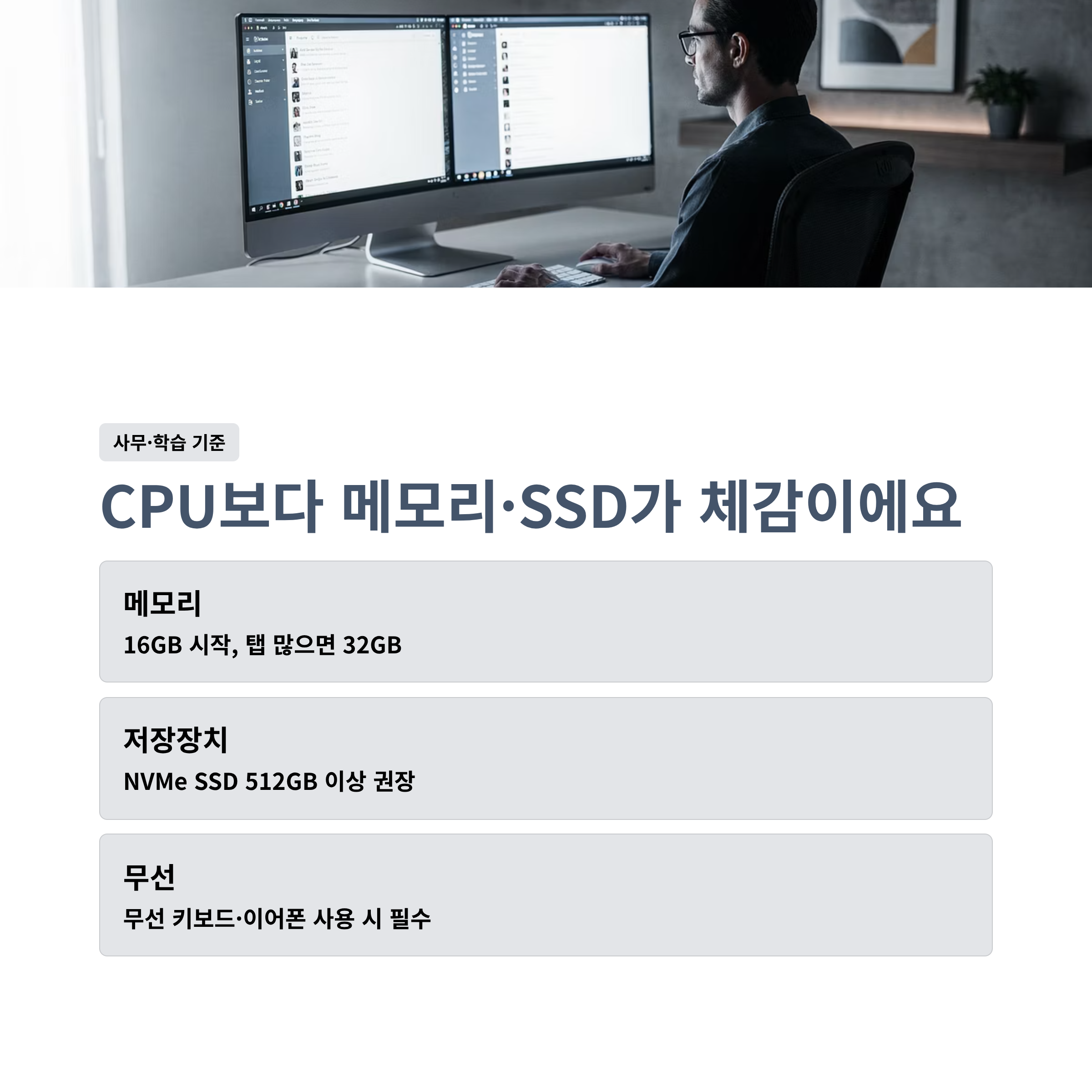 🔍 사무·학습 기준이면 CPU보다 메모리/SSD가 체감이에요