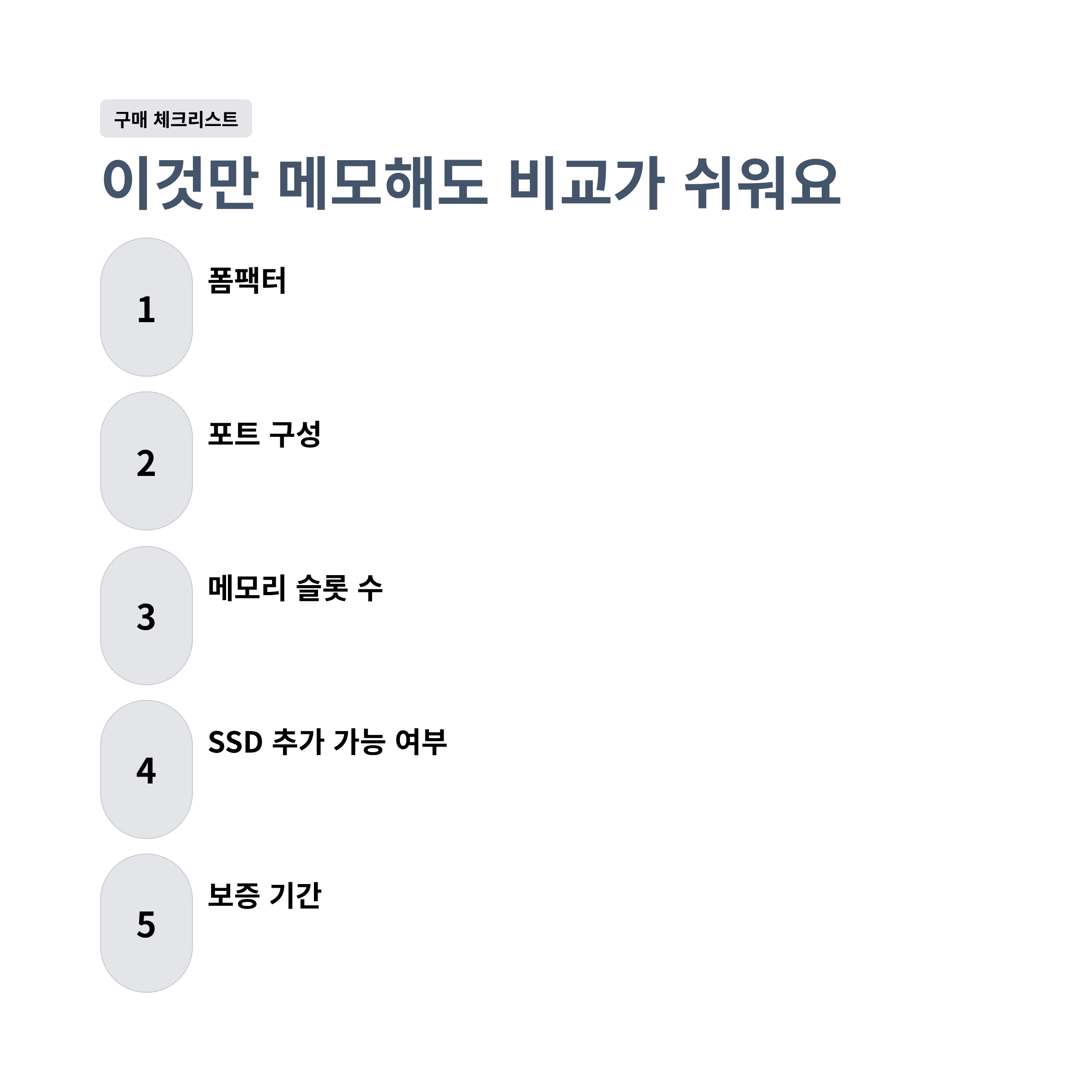 폼팩터, 포트 구성, 메모리 슬롯 수, SSD 추가 가능 여부, 보증 기간만 적어도 선택이 깔끔해집니다.