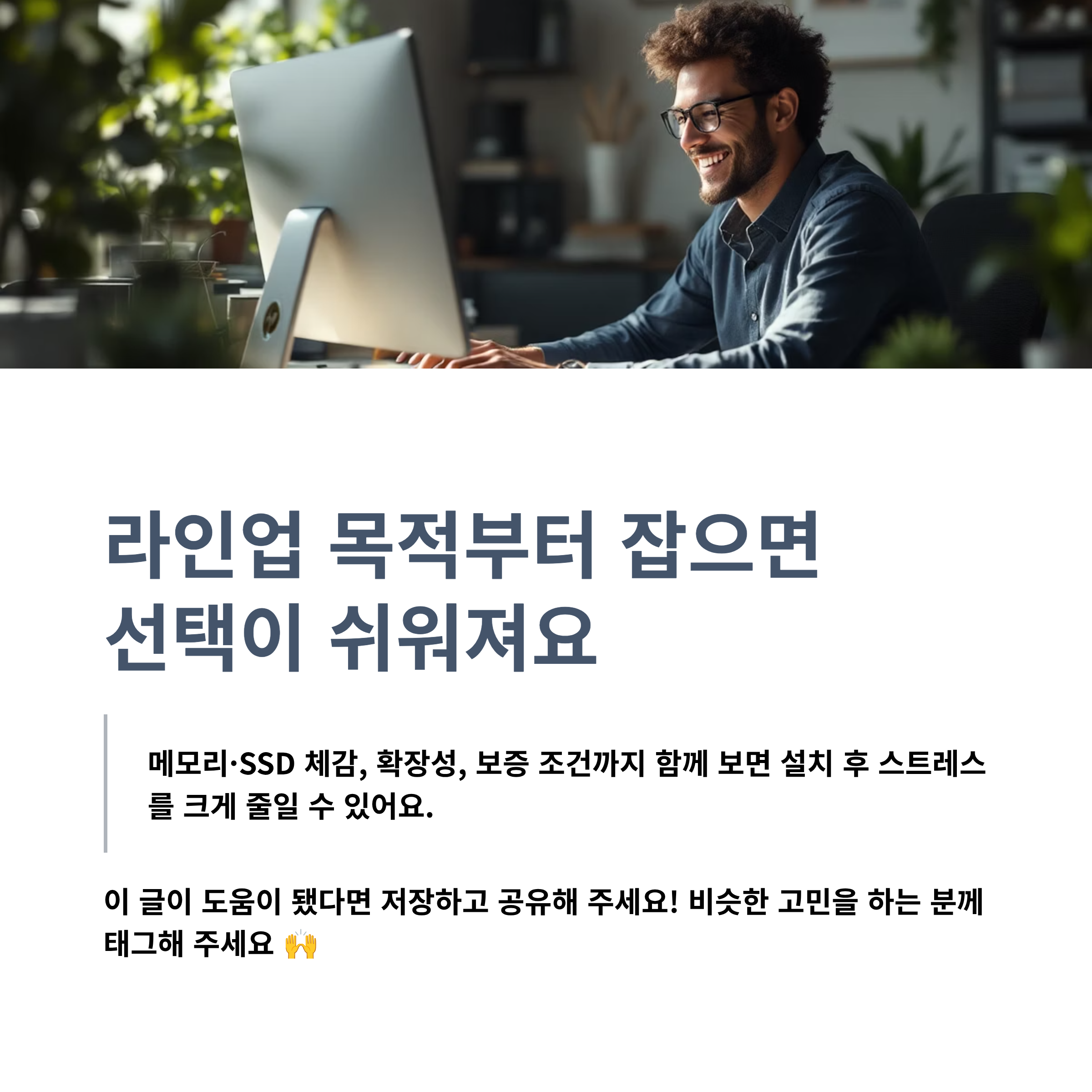 아래 기준대로 보면 “사무용인데 소음이 거슬리거나 업그레이드가 막히는” 상황을 줄일 수 있어요.