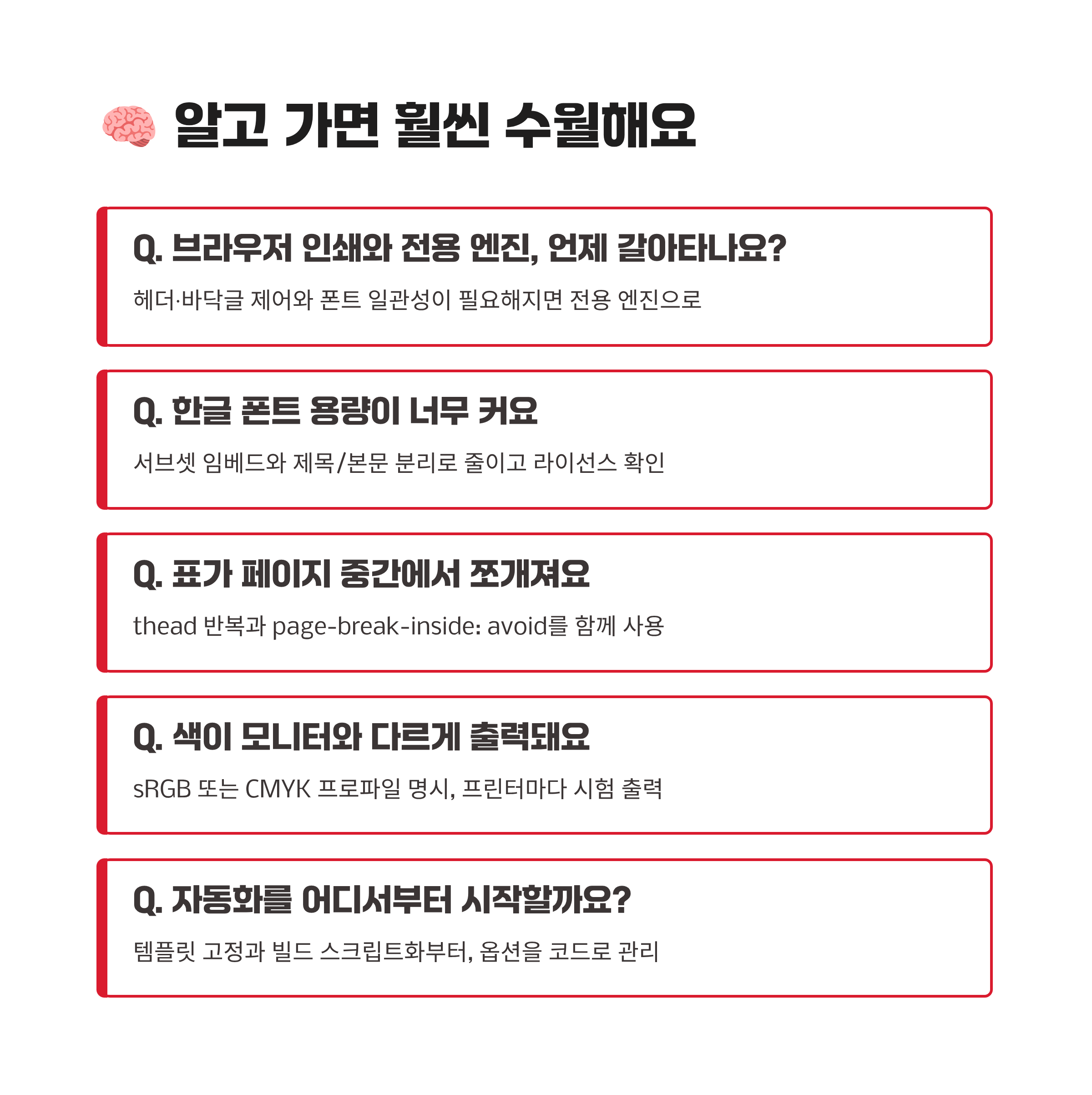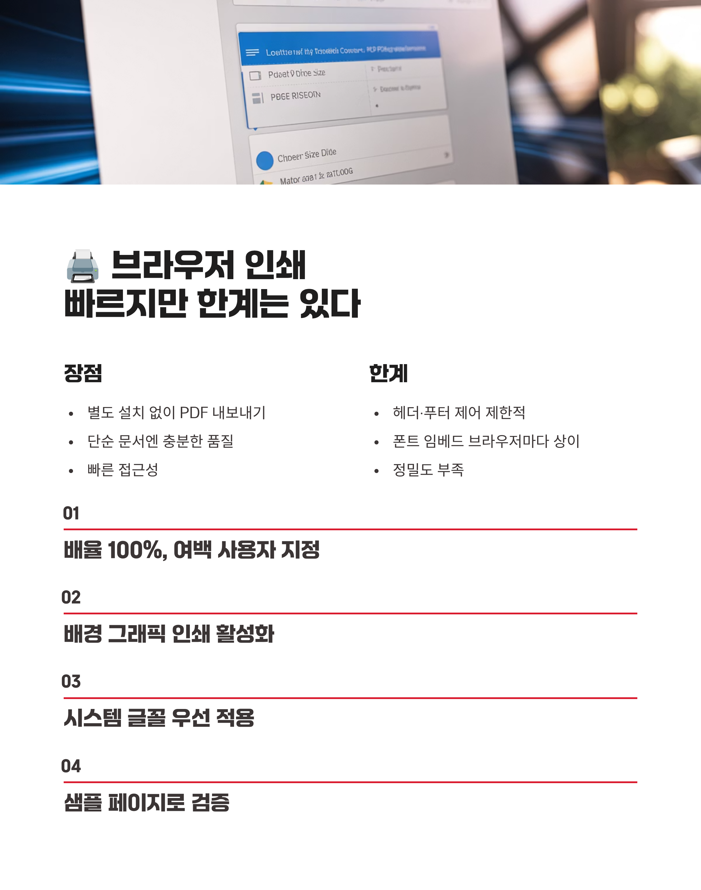 그래도 설정만 잘 만지면 쓸만해요. 배율 100%, 여백 사용자 지정, 배경 그래픽 인쇄를 켜고, 시스템 글꼴을 우선 적용해 의존성을 줄여요. 필요하면 페이지 나누기를 CSS로 강제해 도표가 쪼개지지 않게 막아요.