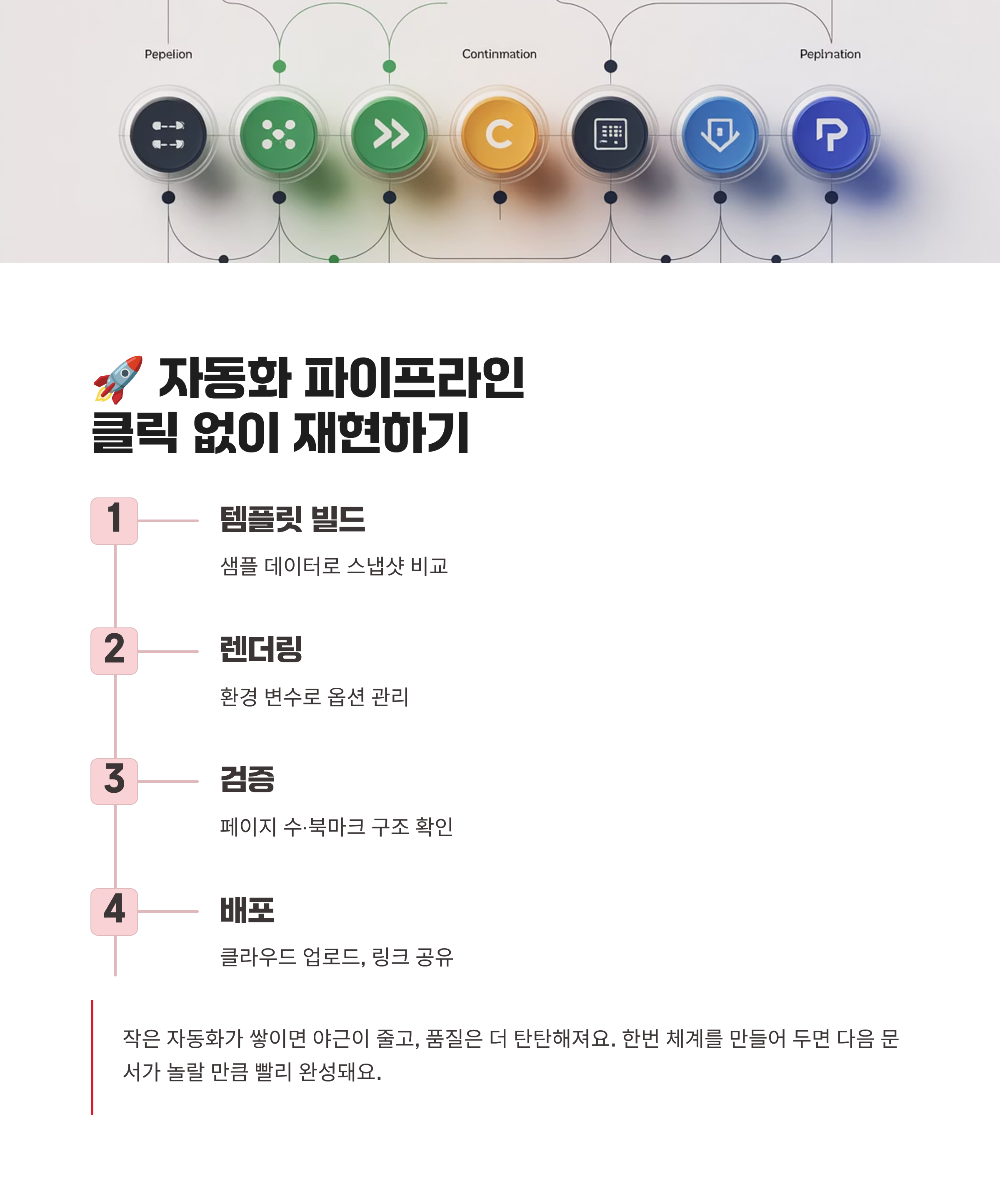 CI에서 템플릿 빌드→렌더→검증을 자동화하면 사람 손이 거의 안 들어가요. 샘플 데이터로 스냅샷 비교를 돌려 페이지 수와 북마크 구조가 바뀌면 바로 알림을 받게 해요. 실패 로그만 봐도 어디서 깨졌는지 감이 잡혀서 수정이 빨라요.