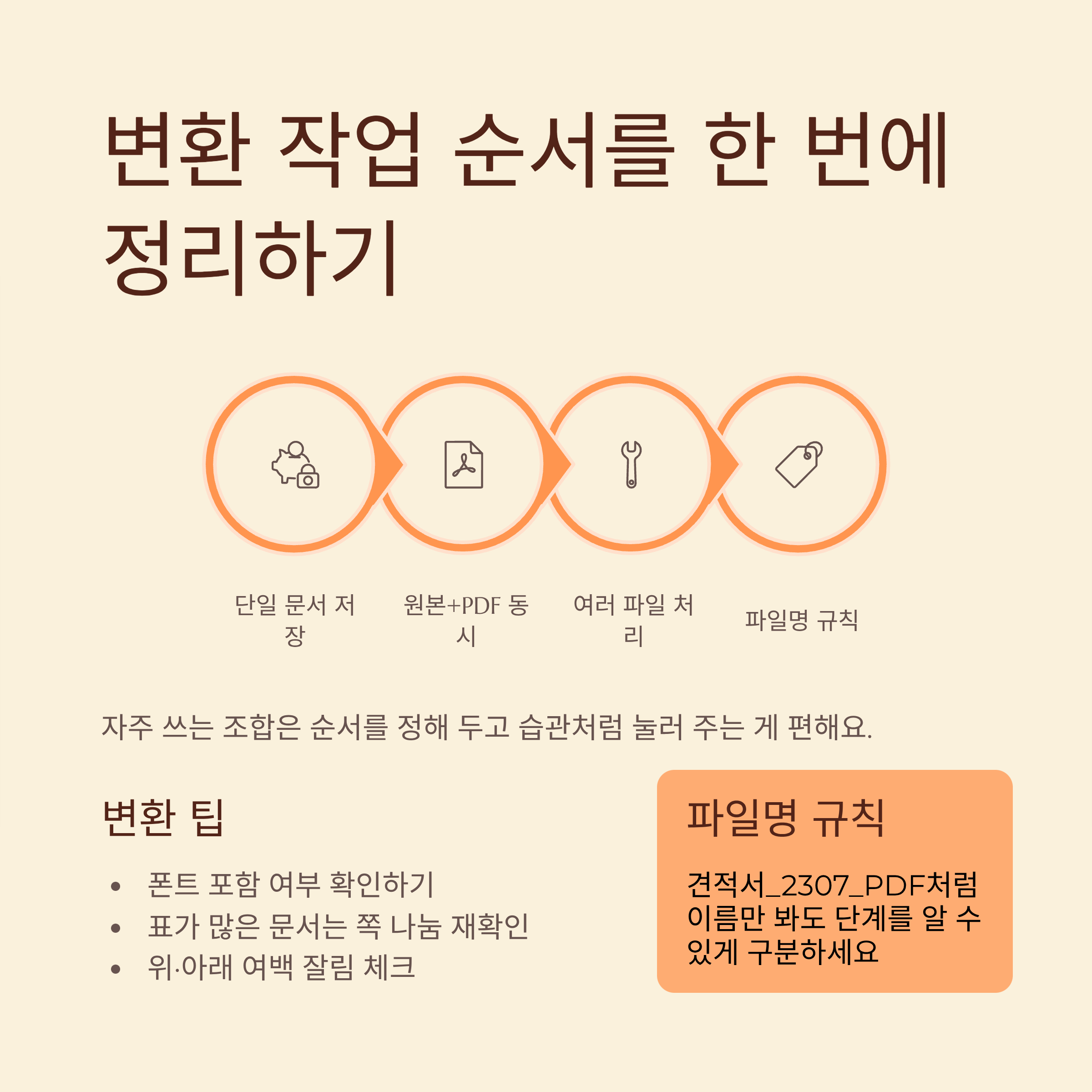 한 번 변환한 문서는 파일 이름에 형식과 날짜를 같이 적어 두면 찾기가 훨씬 쉬워요. 예를 들어 ‘견적서_2307_PDF’처럼 이름만 봐도 어떤 단계의 문서인지 바로 알 수 있게 구분하는 거죠. 아래 요약 표를 참고해서 자주 쓰는 변환 루틴을 직접 만들어 보시면 도움이 될 거예요.