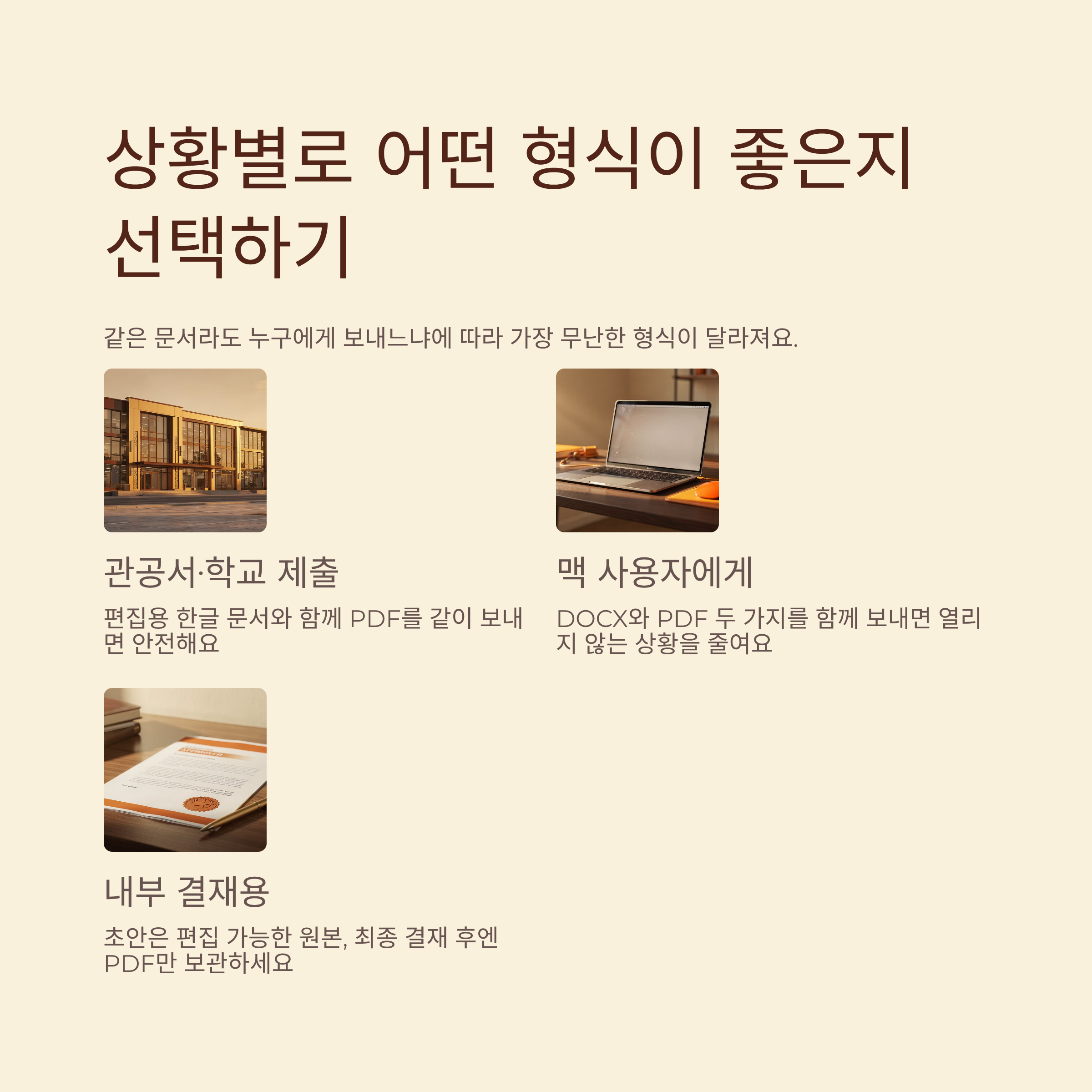 | Q. 관공서나 학교에 서류를 낼 때는 어떤 형식이 안전할까요? | A. 안내문에 형식이 적혀 있지 않다면, 편집용 한글 문서와 함께 PDF를 같이 보내 두면 대부분 문제 없이 진행되는 편이에요. |