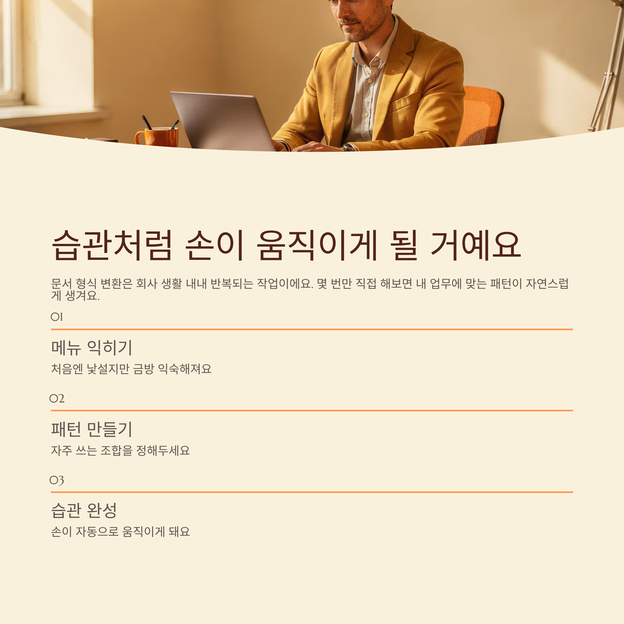 문서 형식을 바꾸는 일은 한 번만 하고 끝나는 게 아니라, 회사 생활 내내 계속 반복되는 작업에 가까워요. 처음에는 메뉴가 낯설어서 어렵게 느껴지지만, 몇 번만 직접 저장해 보고 보내다 보면 내 업무에 맞는 패턴이 자연스럽게 생기더라고요. 오늘 정리한 기준들을 머릿속에만 넣어 두고, 다음에 문서 보낼 일이 생길 때 한 번씩 떠올려 보시면 금방 습관처럼 손이 움직이게 될 거예요.