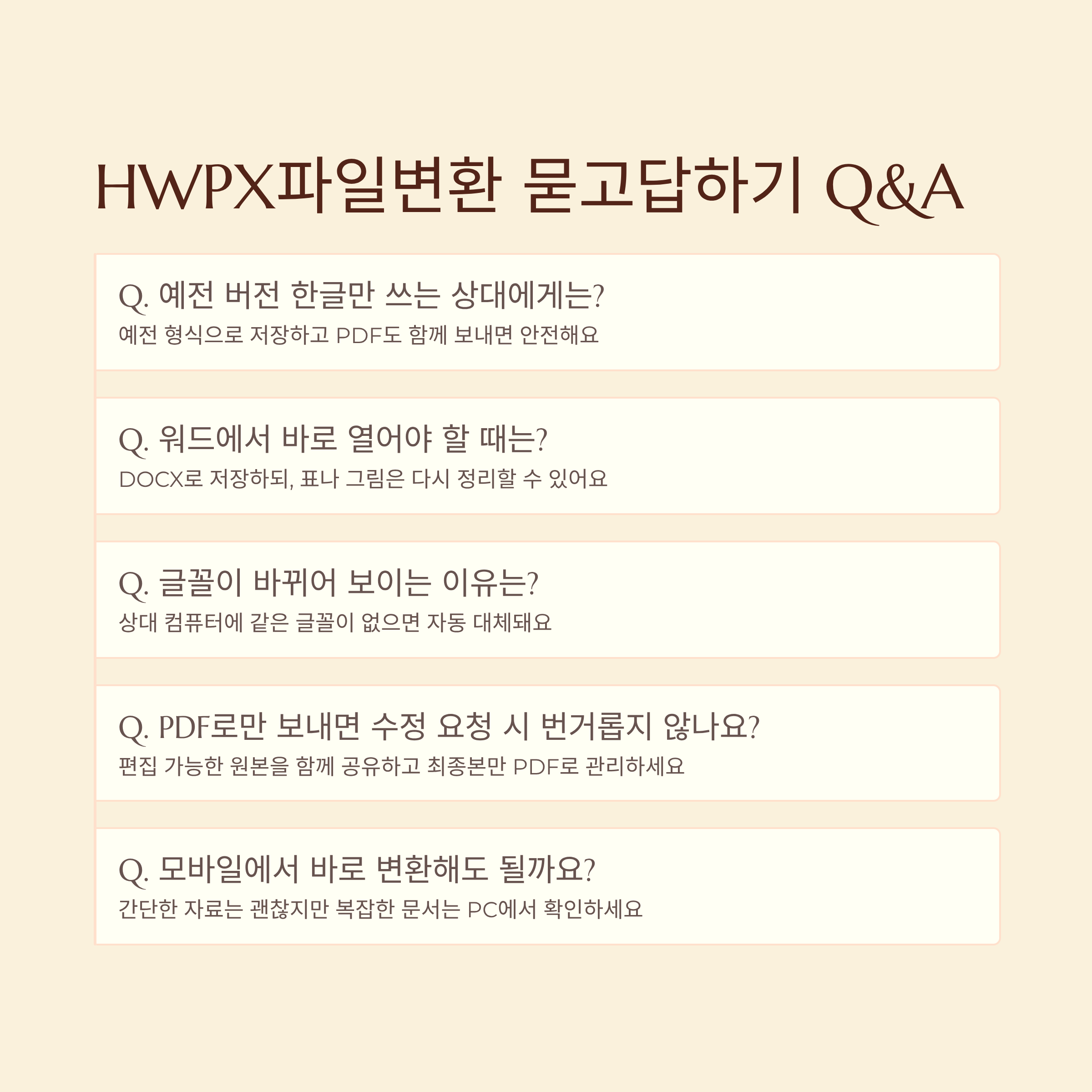| Q. 내부 결재용 문서는 어떤 조합이 좋을까요? | A. 수정이 필요한 초안 단계에서는 편집 가능한 원본을, 최종 결재 후에는 PDF만 따로 보관해 두면 관리가 깔끔해요. |
