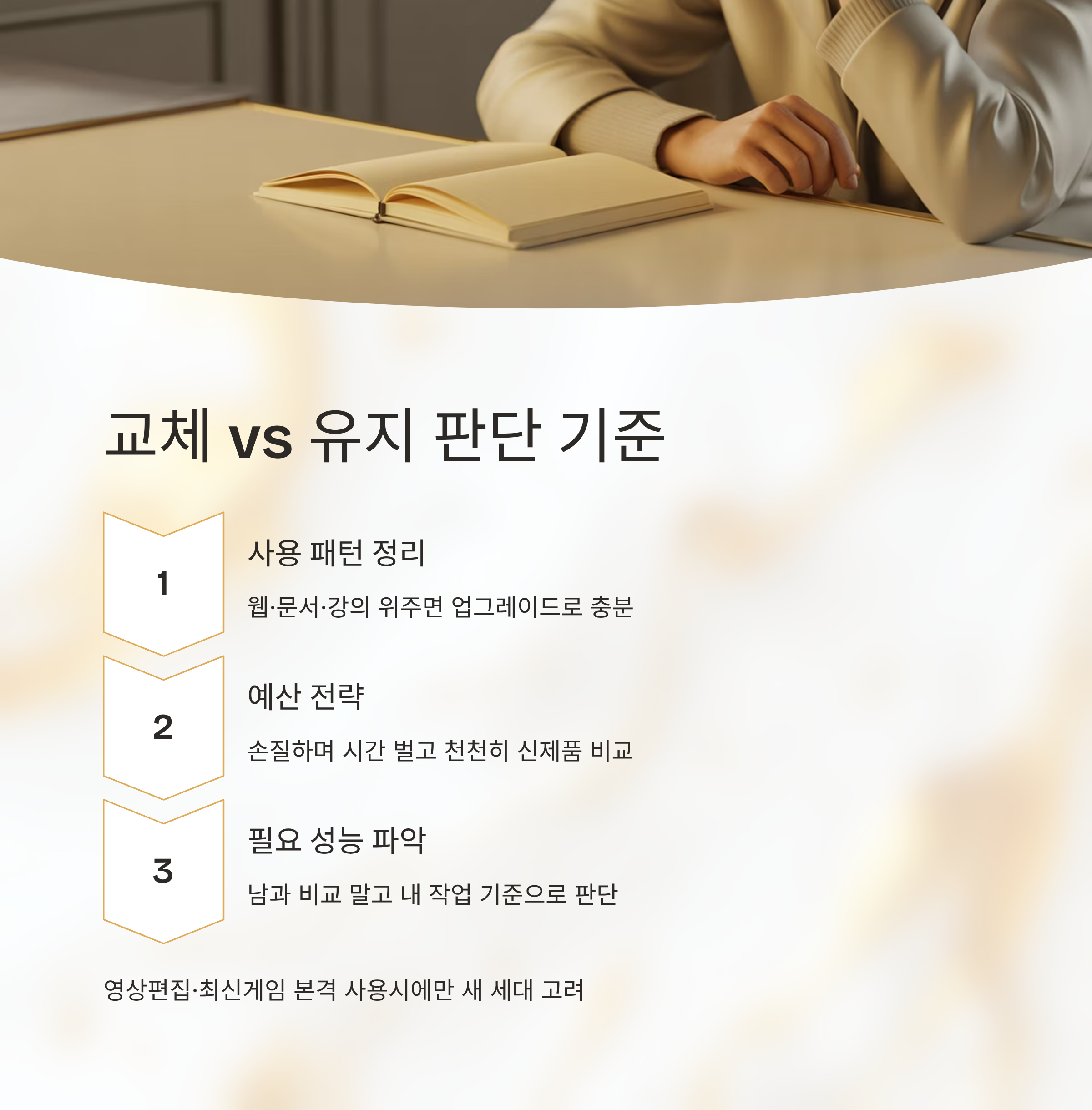 결국 중요한 건 “이 본체를 앞으로 얼마나, 어떤 용도로 쓸지”를 먼저 정하는 거예요. 웹 서핑과 문서 작업, 온라인 강의 정도가 대부분이라면, SSD와 메모리 업그레이드만으로도 몇 년은 더 무리 없이 사용할 수 있어요. 반대로 영상 편집과 최신 게임을 본격적으로 즐기고 싶다면, 코어 수와 아키텍처가 더 앞선 새 세대를 보는 게 장기적으로는 이득이에요. 사용 패턴을 종이에 한 번 적어 보면, 어느 쪽에 더 가까운지 금방 드러나더라고요.
