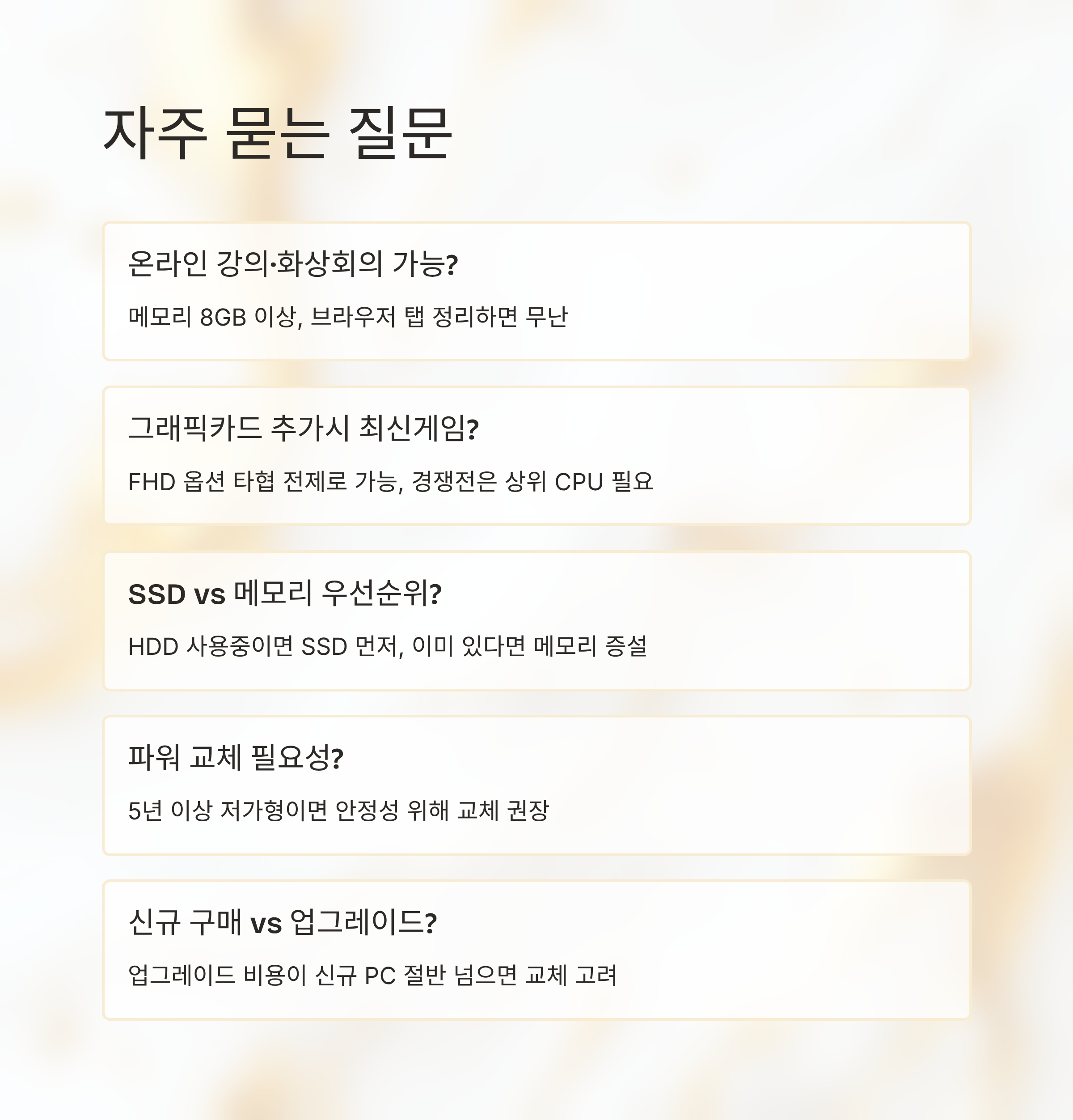 A. SSD·메모리·파워 교체 비용을 모두 더했을 때 새 PC 가격의 절반을 넘어가면, 장기적으로는 새 시스템으로 넘어가는 편이 더 이득인 경우가 많아요.