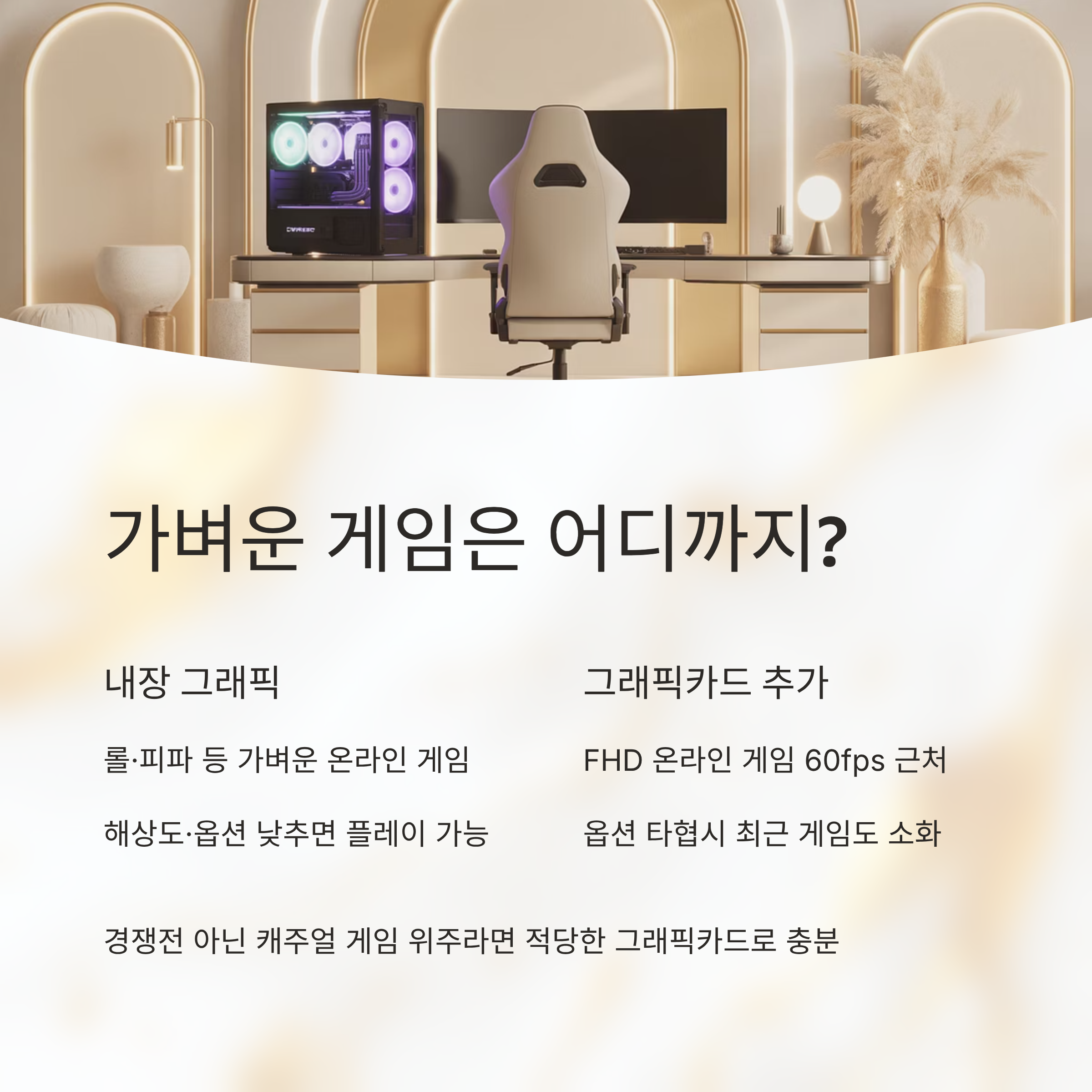 물론 144Hz 이상 고주사율 모니터에서 경쟁전을 제대로 즐기고 싶다면, 코어 수와 캐시가 더 넉넉한 최신 세대로 넘어가는 게 맞아요. 하지만 가끔 친구들과 게임 몇 판 하는 정도, 혹은 캐주얼 게임 위주라면 적당한 그래픽카드 업그레이드만으로도 “아직 써볼 만하다”는 느낌을 꽤 오래 가져갈 수 있어요.
