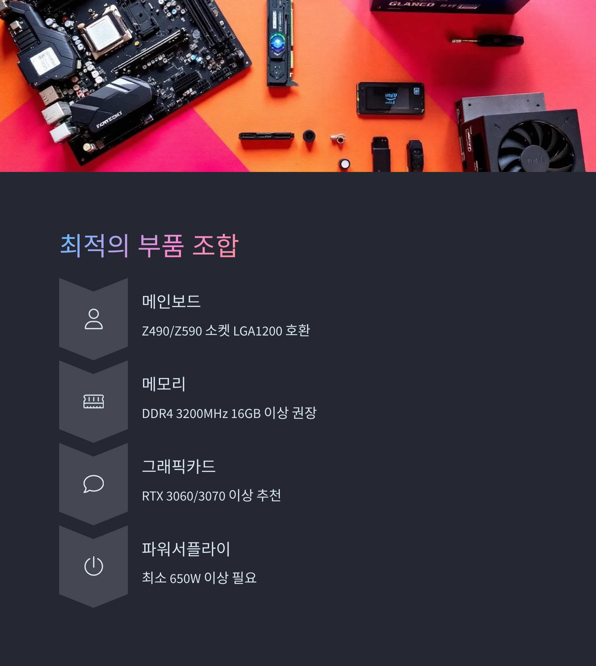 그래픽카드는 RTX 3060, 3070 급 이상과의 조합에서 병목현상이 거의 없으며, 전력 소모가 제법 있는 편이기 때문에 파워서플라이는 최소 650W 이상을 추천드려요. 쿨러는 기본 쿨러가 제공되지 않으므로 별도의 공랭 또는 수랭 쿨러를 준비하셔야 해요. I710700K는 제대로 조합할수록 만족도가 배가되는 모델이에요.