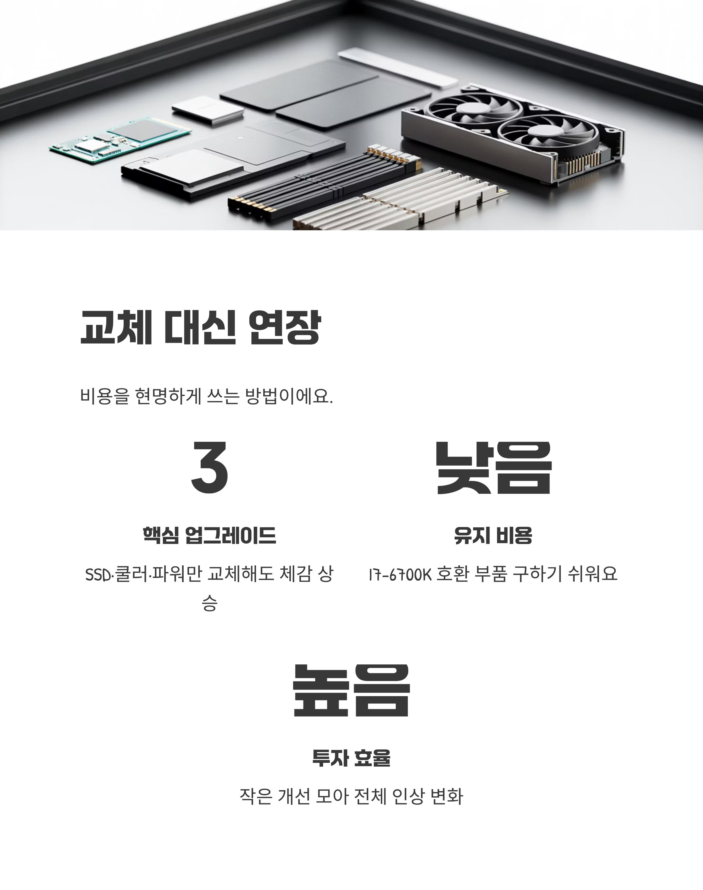 예산이 제한적이면 필요한 부품만 골라 손보는 게 정답이에요. SSD 확장과 쿨러 업그레이드, 파워 교체만으로도 체감이 커요. 모니터 주사율이나 키보드·마우스 같은 주변기기를 손보는 것도 만족도를 올려줘요.