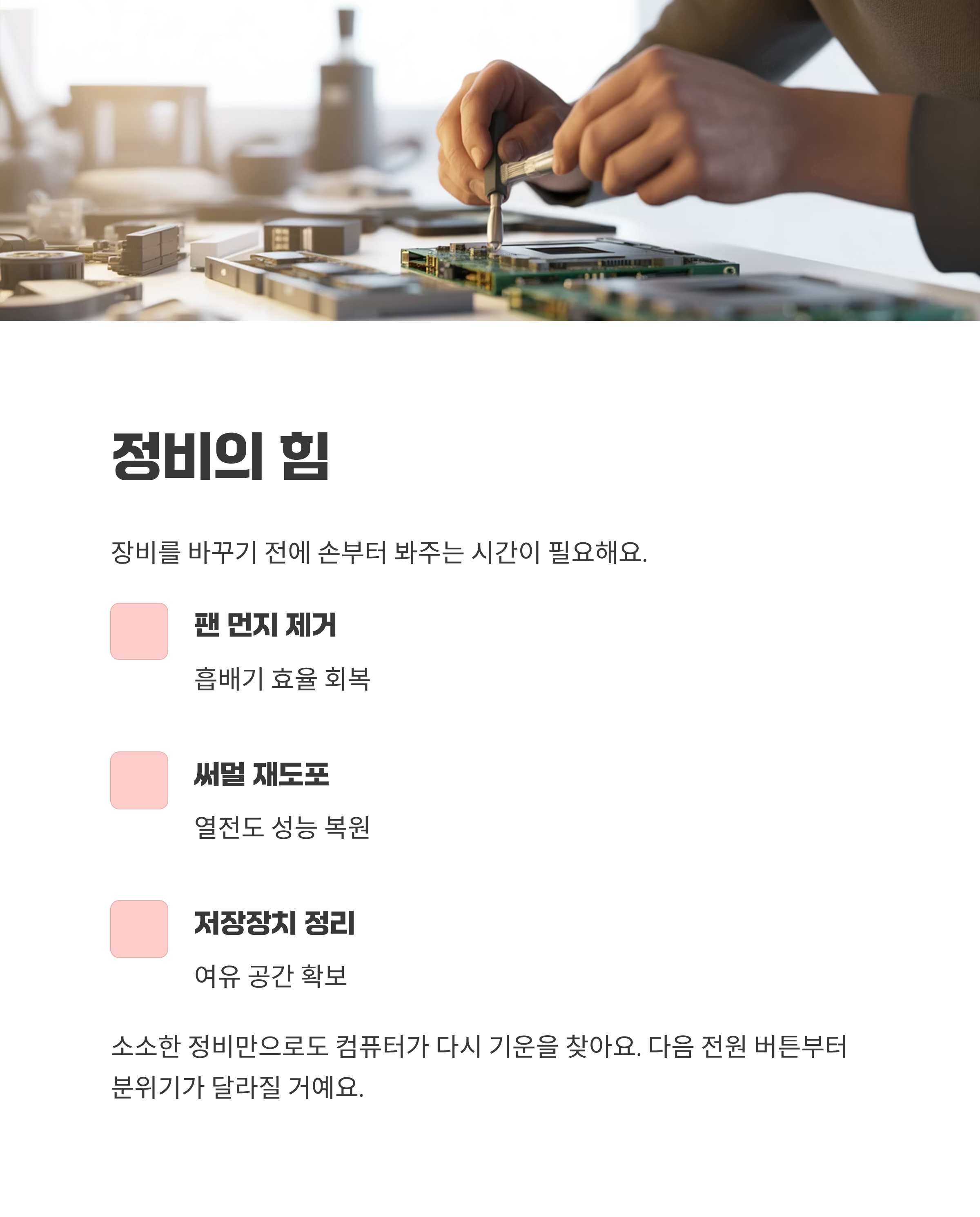 장비를 바꾸기 전에 손부터 봐주는 시간이 있어요. 팬 먼지를 털고, 써멀을 새로 바르고, 저장장치를 정리하는 일들이죠. 이런 소소한 정비만으로도 컴퓨터가 다시 기운을 찾더라고요. 꼭 새로 사지 않아도 괜찮아요. 오늘 체크한 루틴을 한 바퀴 돌려보면, 다음 전원 버튼을 누르는 순간부터 분위기가 달라질 거예요. 익숙한 키보드 소리와 함께, 화면이 먼저 상쾌하게 반겨줄 거예요.