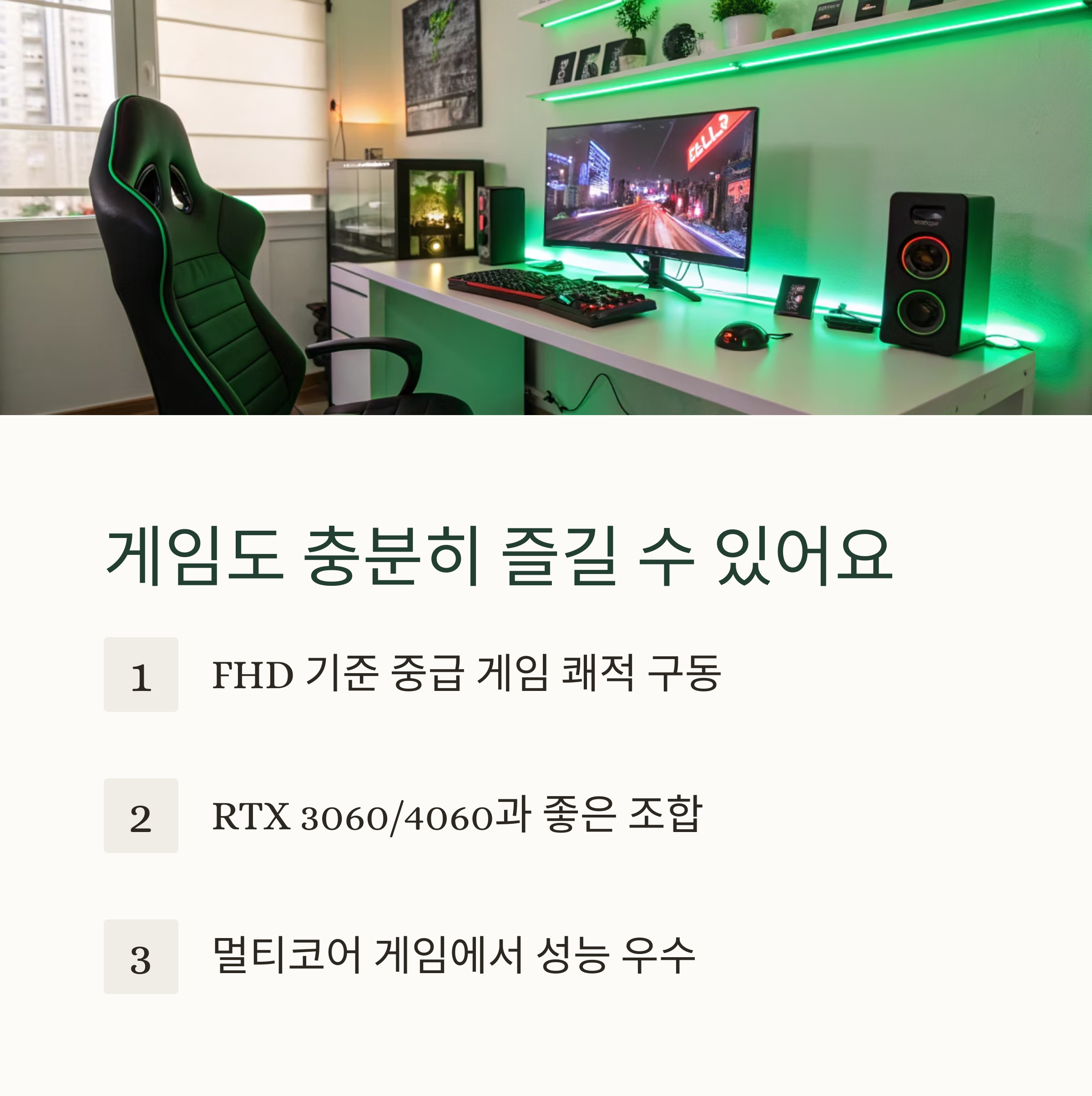 RTX 3060 또는 4060 정도의 그래픽카드와 조합했을 때 안정적인 프레임 유지가 가능했고, CPU 병목 현상도 크게 느껴지지 않았어요. 특히 멀티코어를 지원하는 게임에서 성능이 더 잘 나오는 편이었어요.