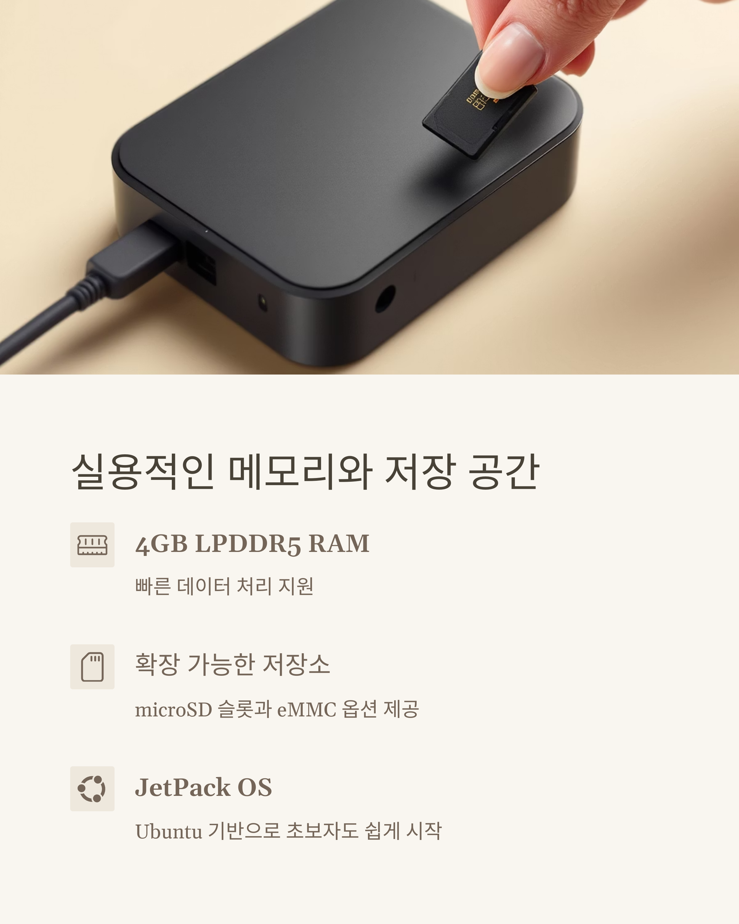 이 제품은 4GB LPDDR5 RAM과 microSD 슬롯, eMMC 버전 옵션을 제공하며, 저장 공간 확장이 자유로워요. Ubuntu 기반 JetPack OS를 통해 CUDA 및 딥러닝 프레임워크가 기본으로 구성되어 있어 초보자도 쉽게 시작할 수 있어요.