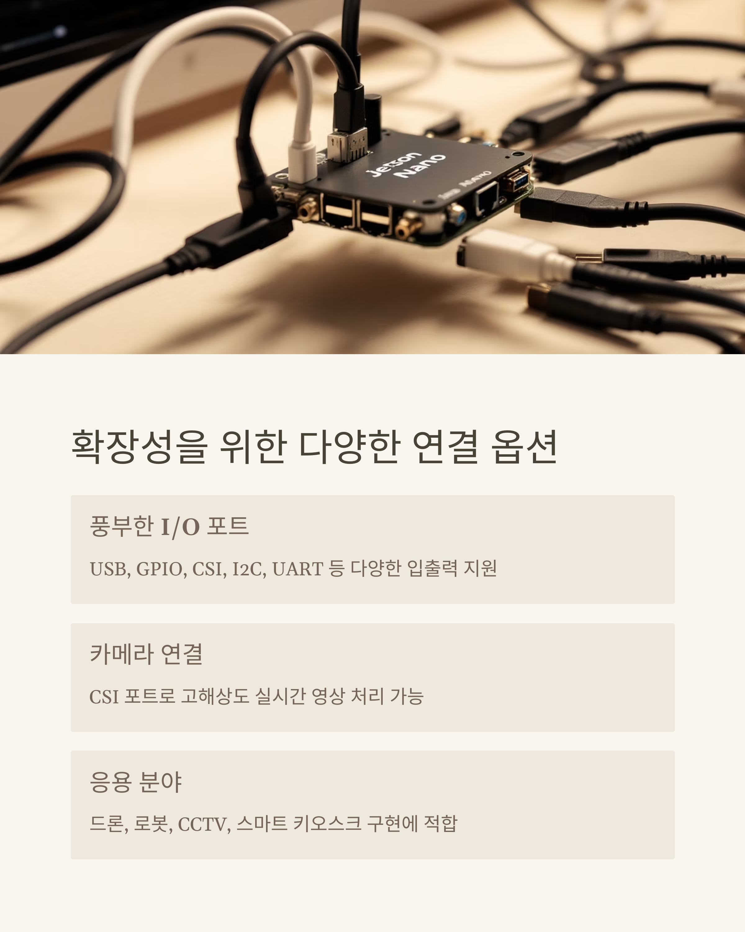 이 보드는 USB, GPIO, CSI, I2C, UART 등 풍부한 입출력 포트를 제공해 각종 센서, 카메라 모듈, 디스플레이와의 연결이 쉬워요. 드론, 로봇, CCTV, 스마트 키오스크 등 다양한 응용 제품을 구현하는 데도 적합해요.