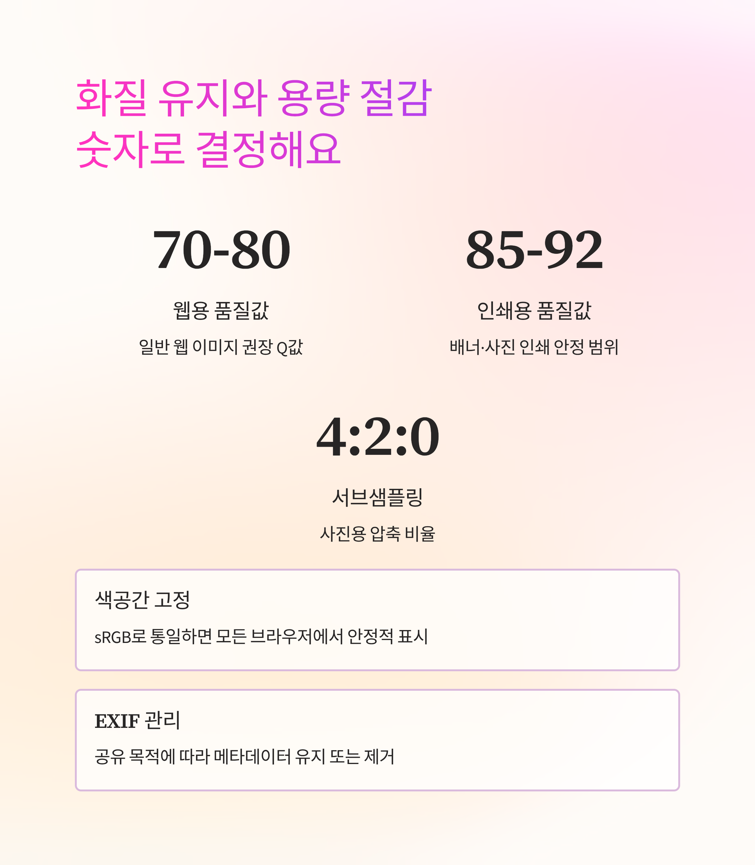 일반 웹용은 품질 70~80(Q=70~80)이 체감상 충분하고, 큰 배너나 사진 인쇄는 85~92가 안정적이에요. 서브샘플링은 사진은 4:2:0, 글자/선이 많은 이미지는 4:4:4가 좋아요. 선명도는 샤픈보다 원본 해상도 조정이 효과가 커요. 리사이즈는 긴 변 기준으로 맞추고, 필요하면 소폭의 언샵 마스크로 마무리해요.