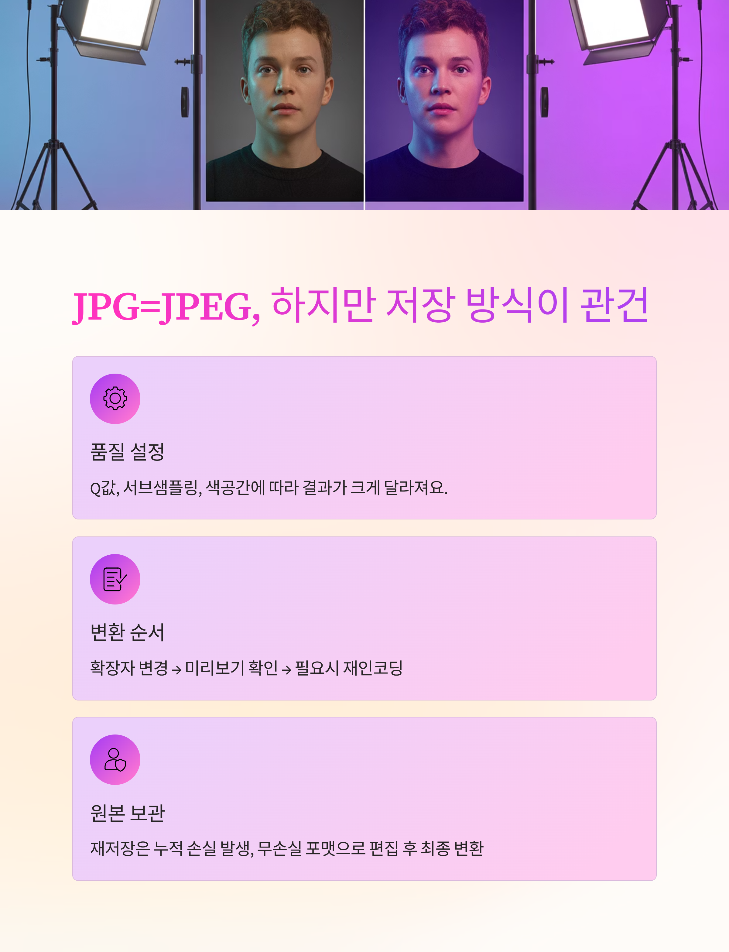 재저장이 필요한 대표 상황은 세 가지예요. ① 색공간을 sRGB로 통일해야 할 때 ② 메타데이터를 지우거나 남겨야 할 때 ③ 용량을 줄이려는 목적일 때예요. 이때는 원본을 열고 품질값과 서브샘플링을 직접 지정하세요. 미리보기 100%로 확인하면 계단 현상이 금방 보여요.
