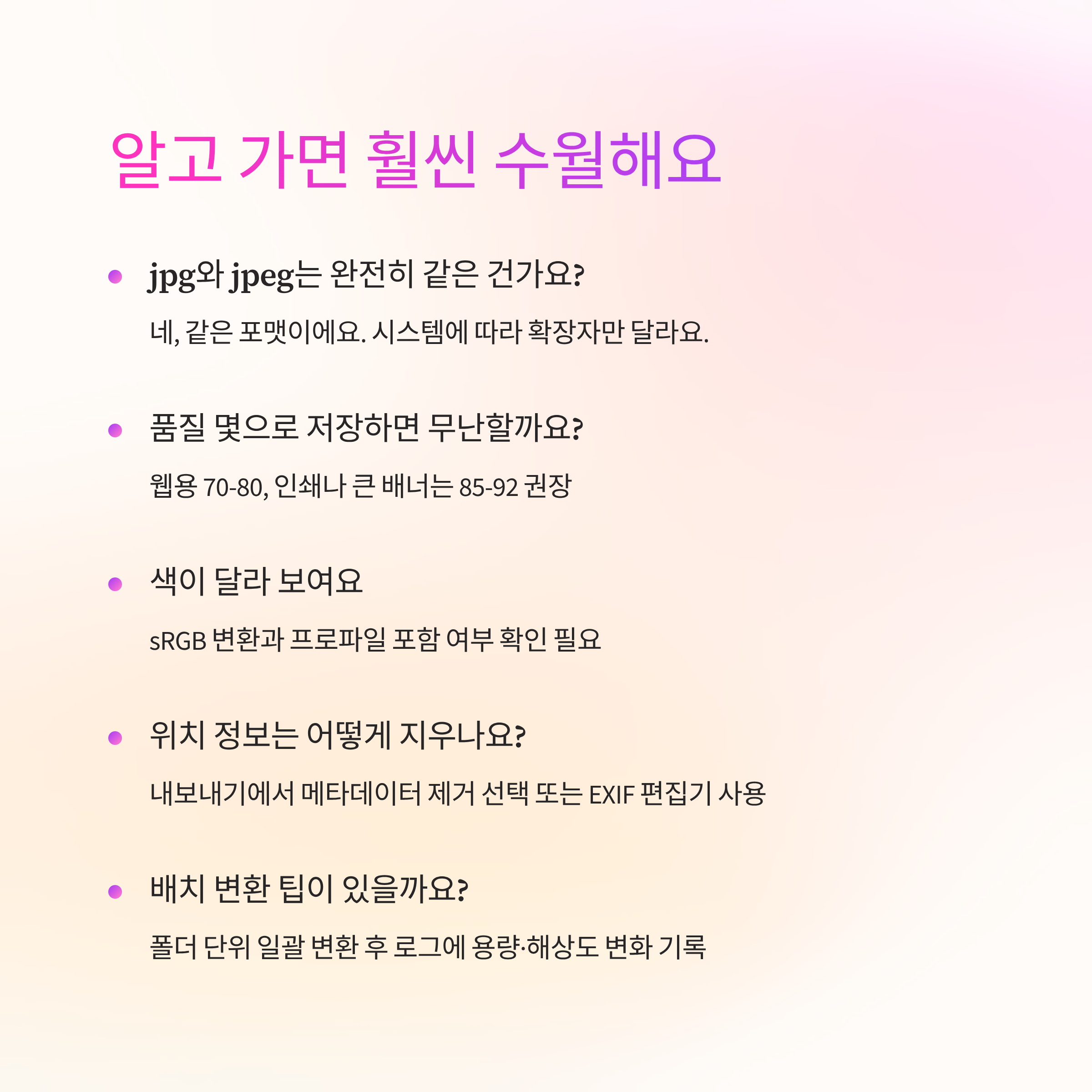 배치 작업은 자동화가 편해요. 폴더 단위로 일괄 변환하고, 로그에 파일명/해상도/용량 변화만 남겨도 추적이 쉬워요. 변환 리포트 첫 줄에 JPEGJPG변환 결과 요약(예: -42%, sRGB로 통일)을 적어두면 공유가 단정해져요.