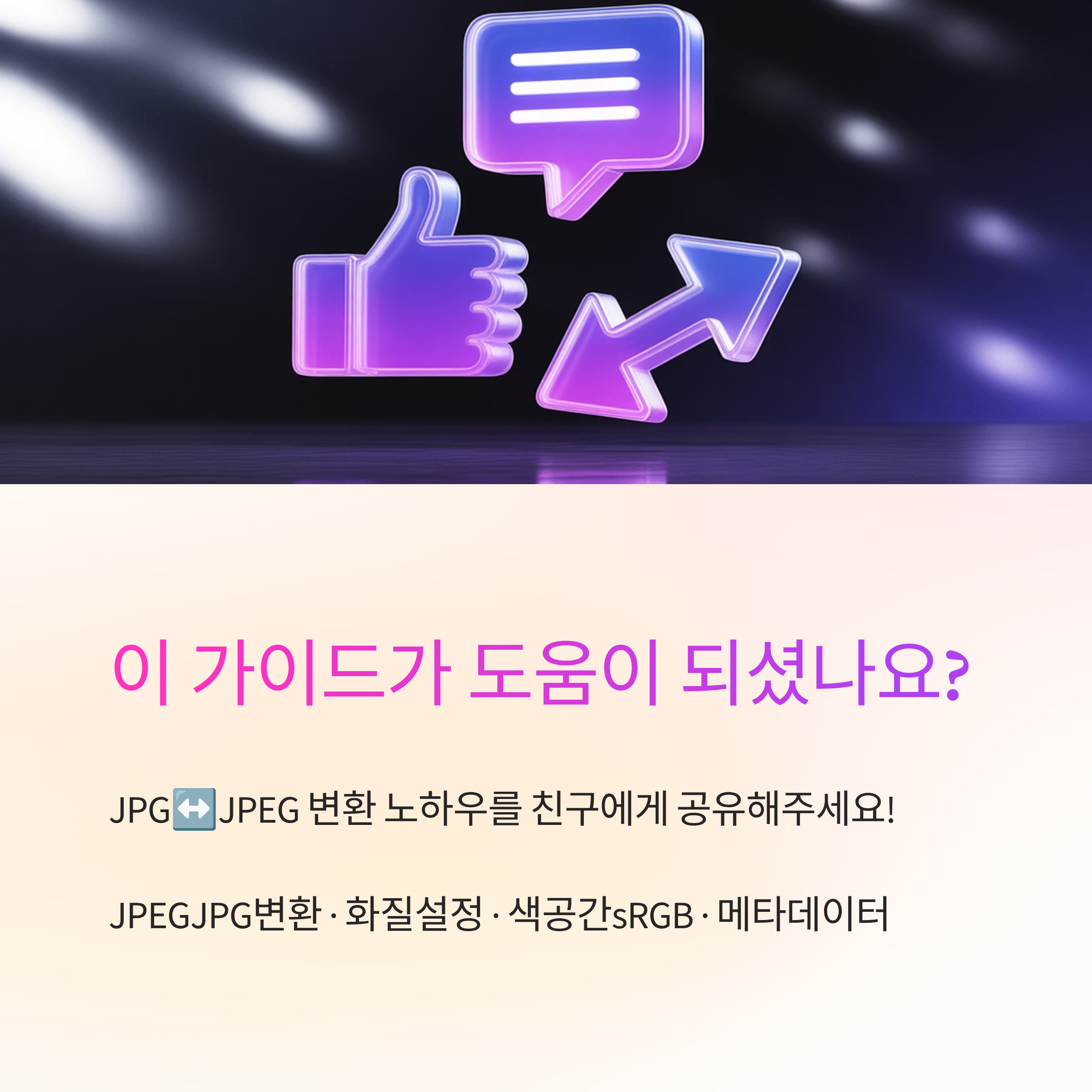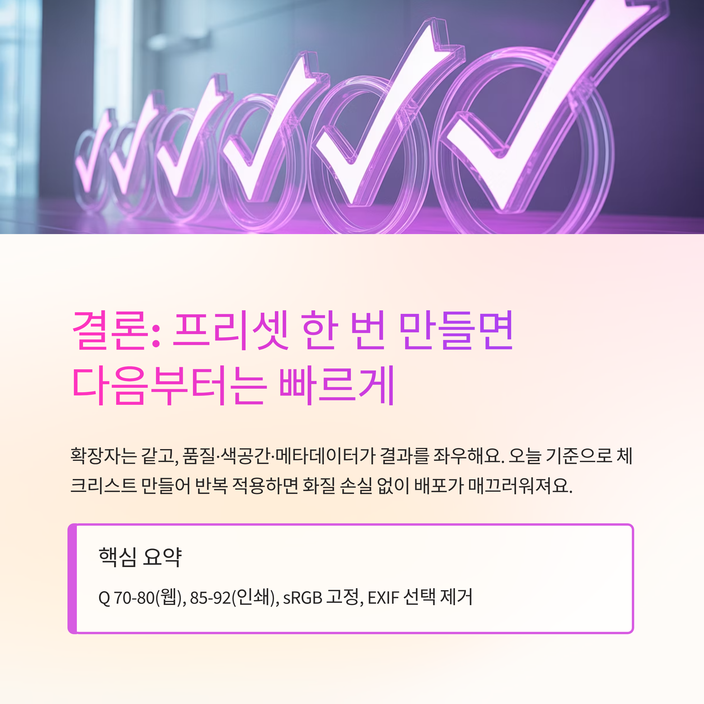 결론은 간단해요. 확장자는 같고, 품질과 색공간·메타데이터가 결과를 좌우해요. 오늘 기준대로만 정리하면 화질을 거의 잃지 않으면서도 업로드와 배포가 훨씬 매끄러워져요. 프리셋과 체크리스트를 한 번 만들어 두고 반복 적용해보세요. 몇 번만 돌려도 감이 잡히고, 다음 변환은 생각보다 빨리 끝날 거예요.