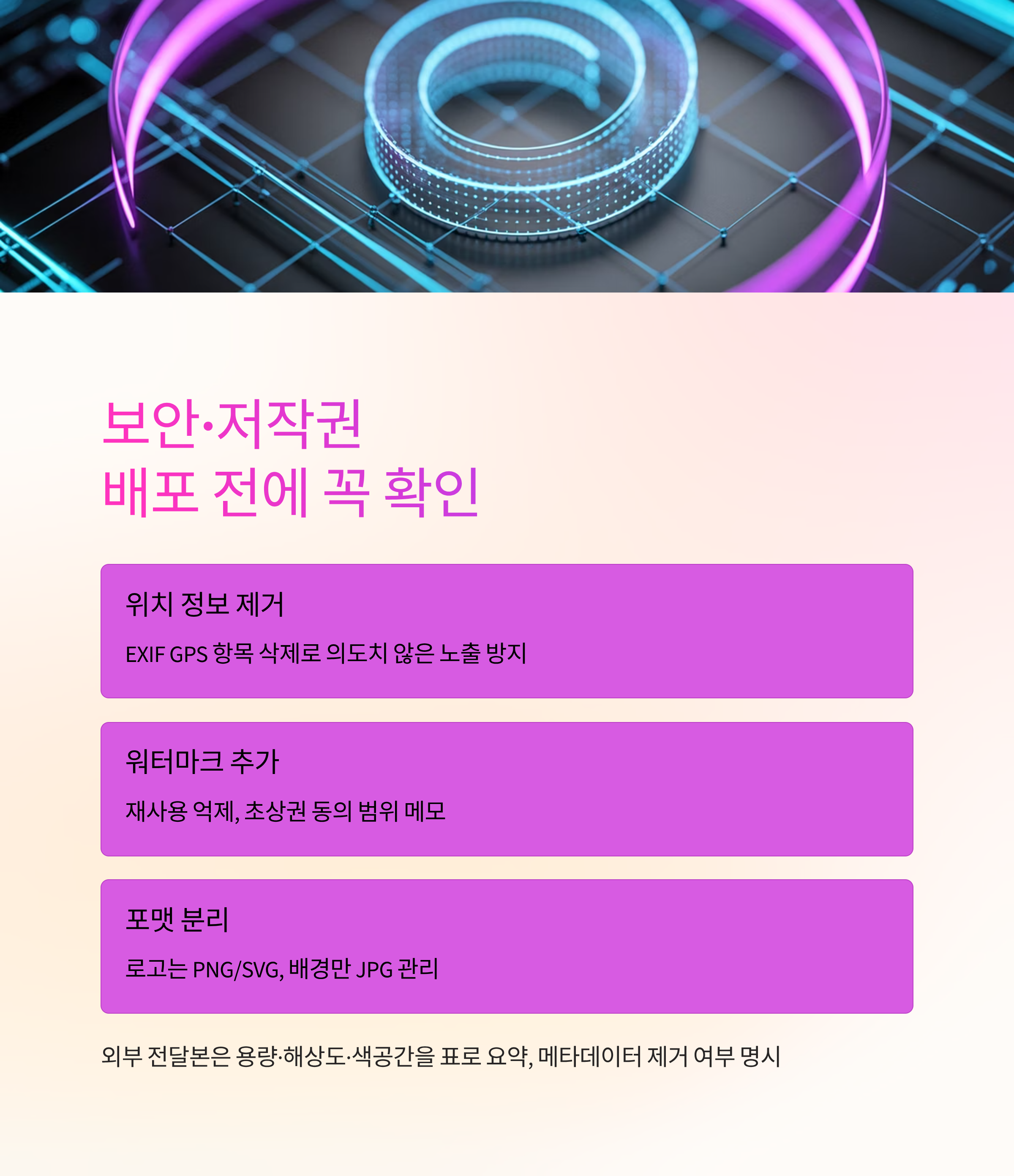 브랜드 자산은 색이 조금만 틀어져도 문제예요. 로고는 JPG보다 PNG/SVG가 안전하고, 배경 사진만 JPG로 관리하는 식의 분리가 좋아요. 계약서에 전달 포맷을 못 박아두면 재작업이 줄어요.