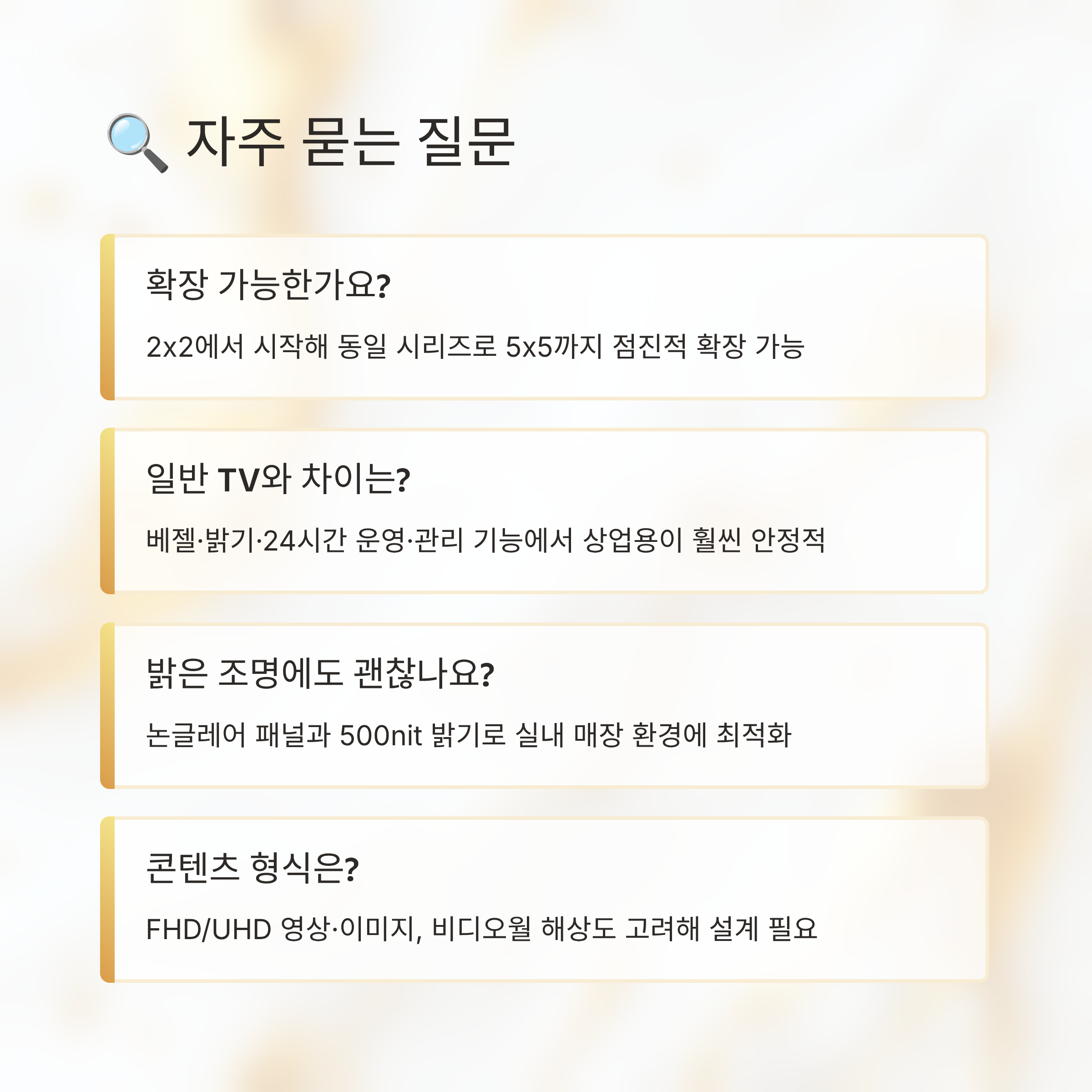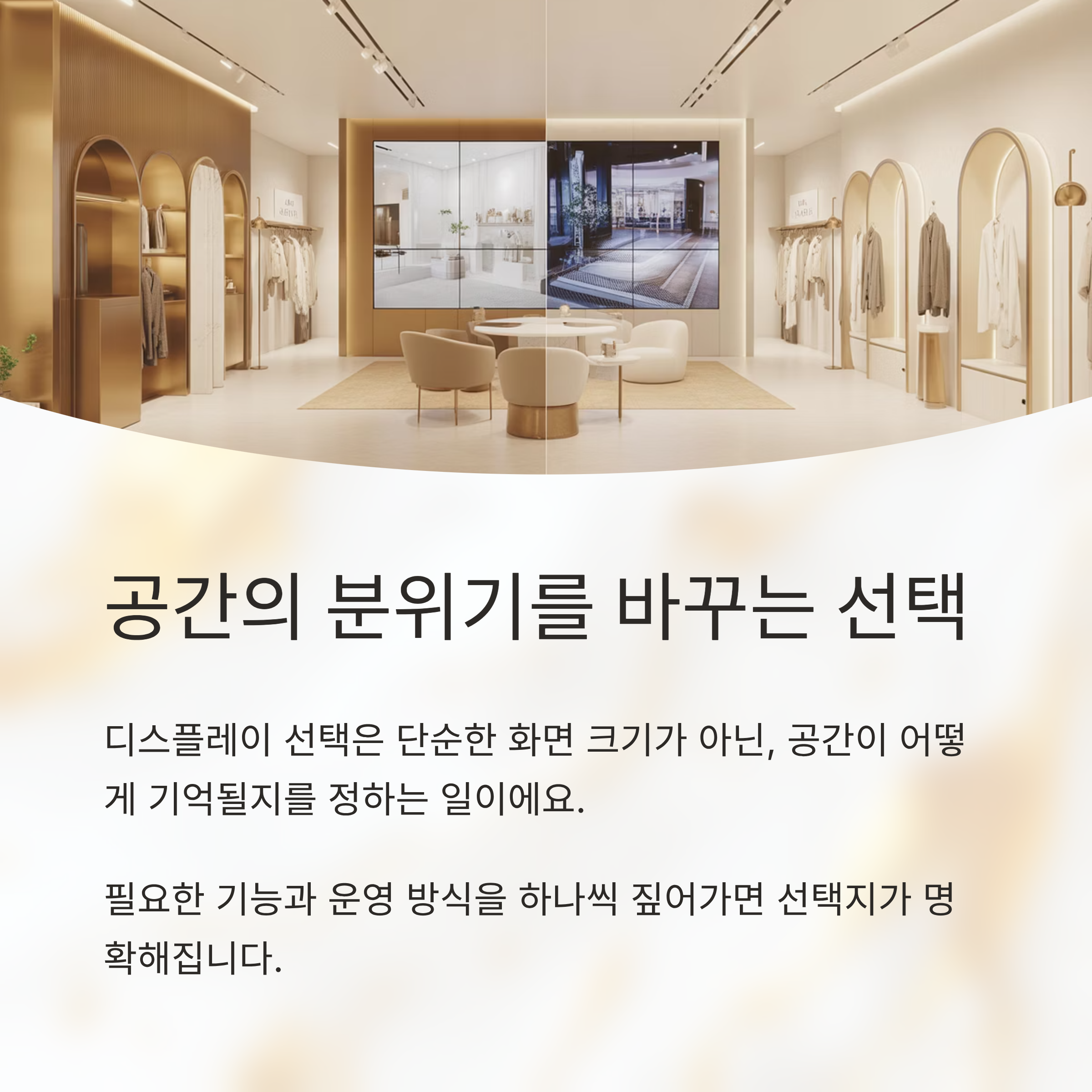 공간에 맞는 디스플레이를 고른다는 건 단순히 화면 크기만 정하는 일이 아니라, 앞으로 그 공간이 어떤 느낌으로 기억될지를 함께 정하는 일에 가까운 것 같아요. 설치 전에는 다소 복잡하게 느껴질 수 있지만, 필요한 기능과 운영 방식을 하나씩 짚어가다 보면 의외로 선택지가 많이 좁혀지더라고요. 이번에 정리한 내용들이 여러분이 만들고 싶은 화면과 분위기를 조금 더 선명하게 떠올리는 데 작은 참고가 되었으면 해요.