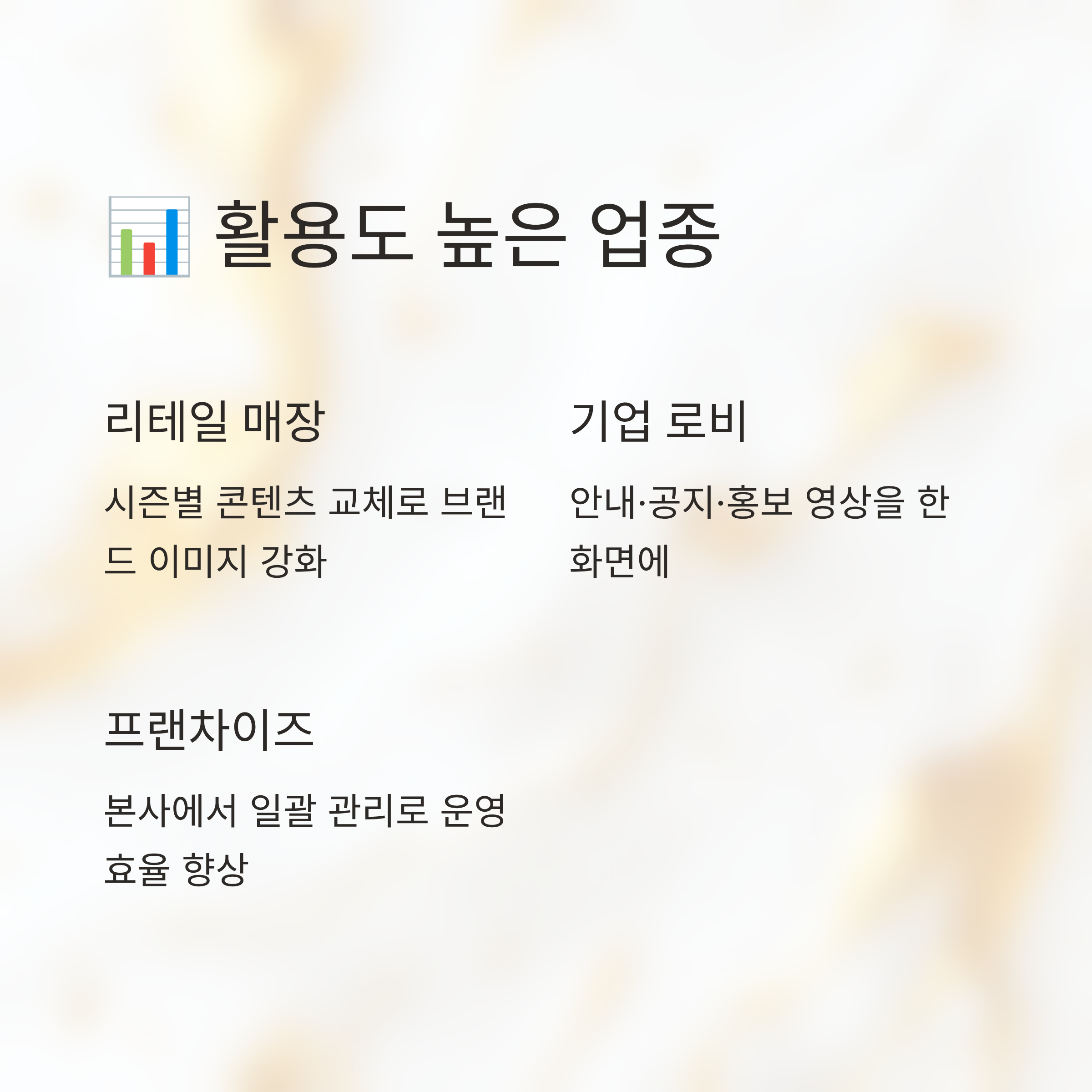 공공기관이나 기업 로비에서는 안내문, 공지, 홍보 영상까지 한 화면에 담아낼 수 있어서, 기존의 배너나 인쇄물을 대체하는 역할도 해요. 운영 시나리오만 잘 설계해 두면, 방문객에게 전달하고 싶은 메시지를 시간대별로 다르게 보여주는 것도 가능해서, 정보 전달과 이미지 제고를 한 번에 잡을 수 있는 도구가 되어 줍니다.