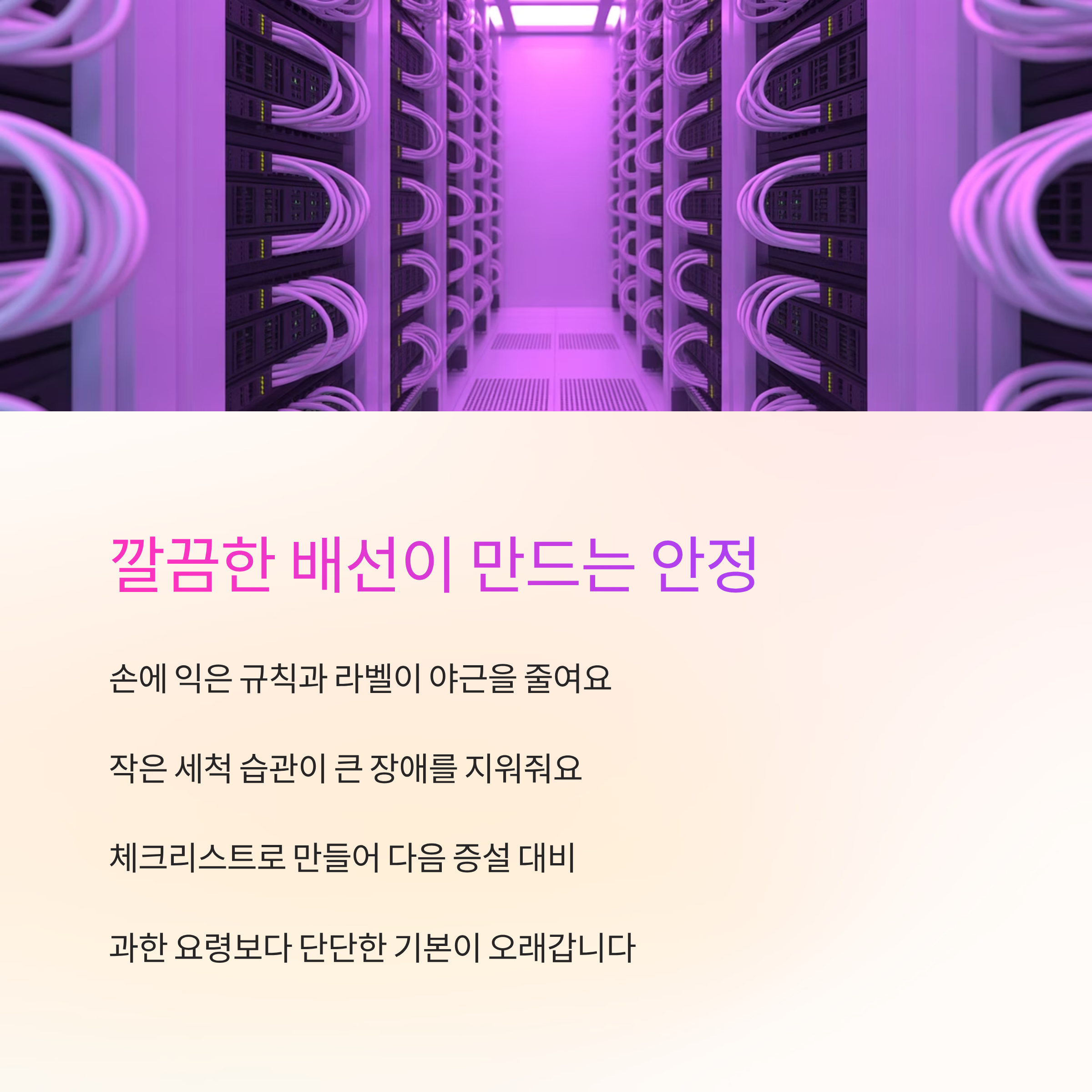 배선이 깔끔해지면 화면 대신 마음이 먼저 편안해져요. 손에 익은 규칙과 라벨 하나가 야근을 줄여주고, 작은 세척 습관이 큰 장애를 지워줘요. 장비는 결국 사람이 다루는 도구라서, 작업자의 리듬이 안정되면 품질도 자연스럽게 안정돼요. 오늘 정리한 기준을 현장 가방 속 체크리스트로 만들어 두면, 다음 증설은 훨씬 담담하게 끝날 거예요. 과한 요령보다 단단한 기본이 오래갑니다.