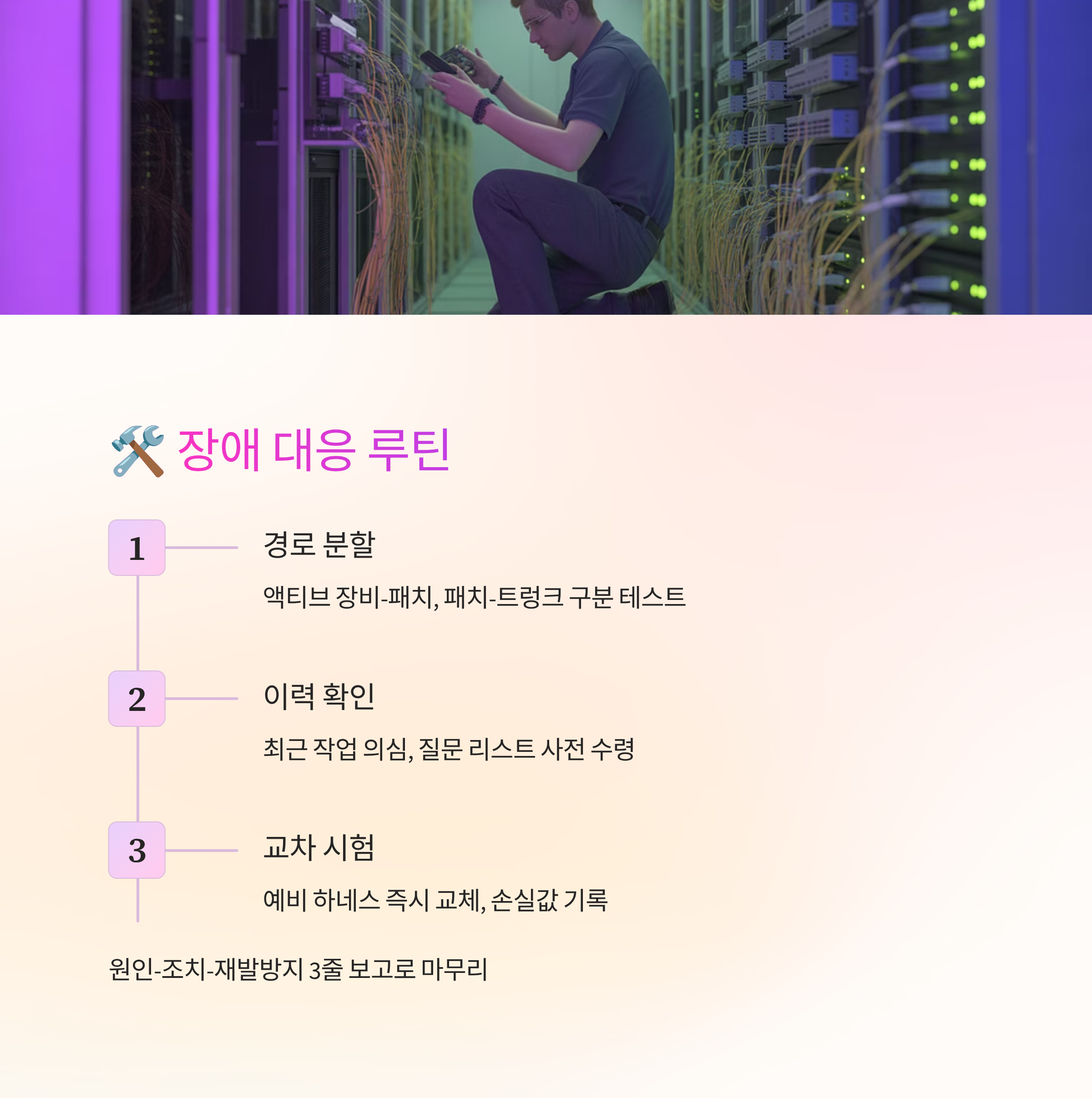 알람이 오면 먼저 경로를 두 조각으로 나눠요. 액티브 장비–패치, 패치–트렁크–원격 패치로 구분해 테스트하면 범위가 눈에 들어와요. 손실이 갑자기 커졌다면 최근 작업 이력을 먼저 의심해요. 바뀐 건 늘 단서예요.