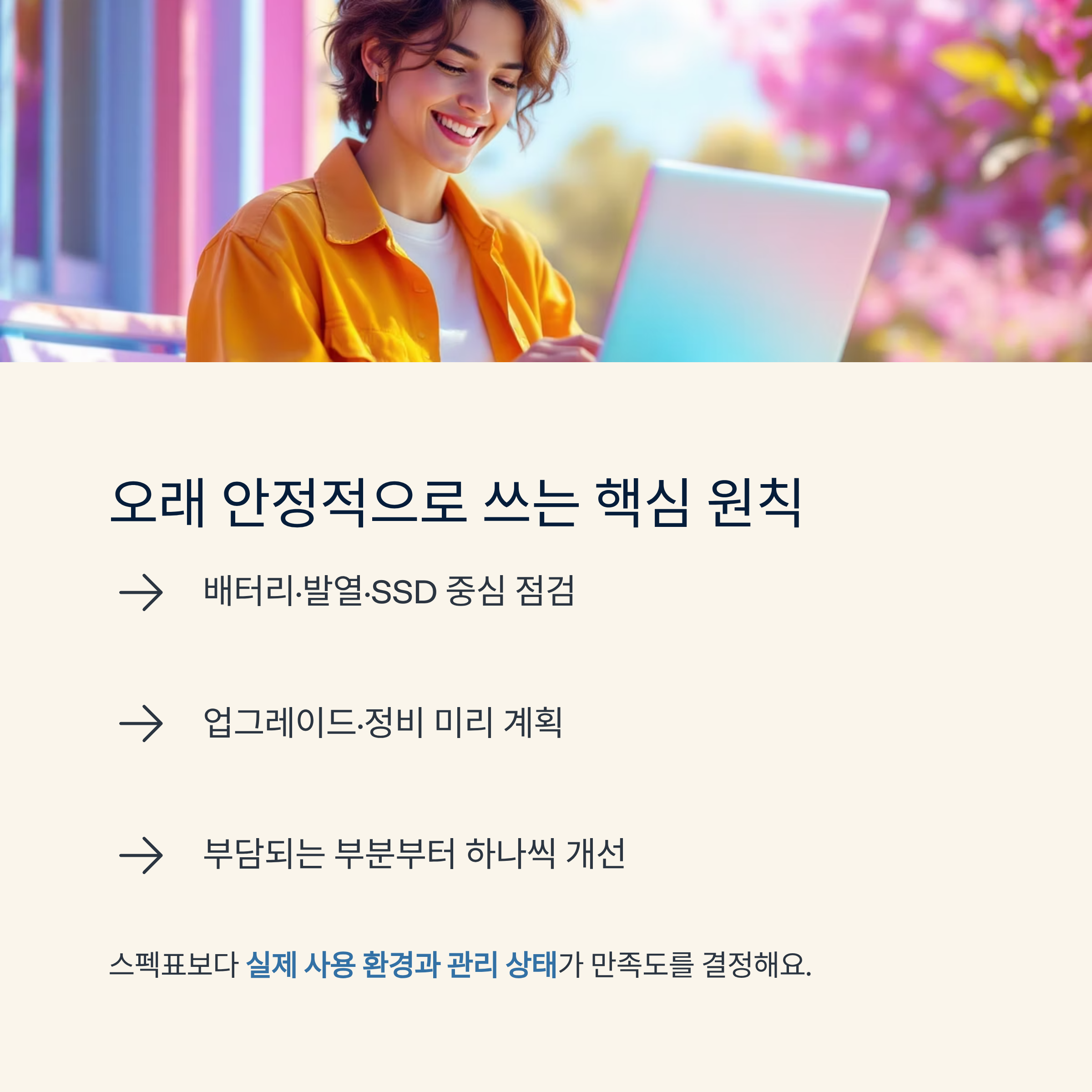 노트북 한 대를 오래 안정적으로 쓰려면 스펙표만 보는 것보다 실제 사용 환경과 관리 상태를 함께 보는 것이 중요해요.