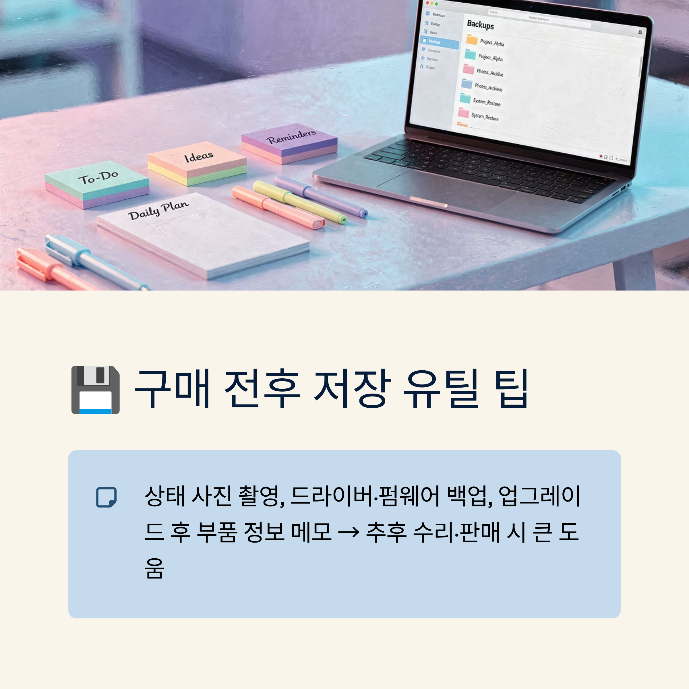 구매 전후 상태 사진 촬영, 드라이버·펌웨어 설치 파일 백업, 업그레이드 후 부품 정보 메모를 함께 정리해 두면 추후 수리나 판매 시에 큰 도움이 돼요.