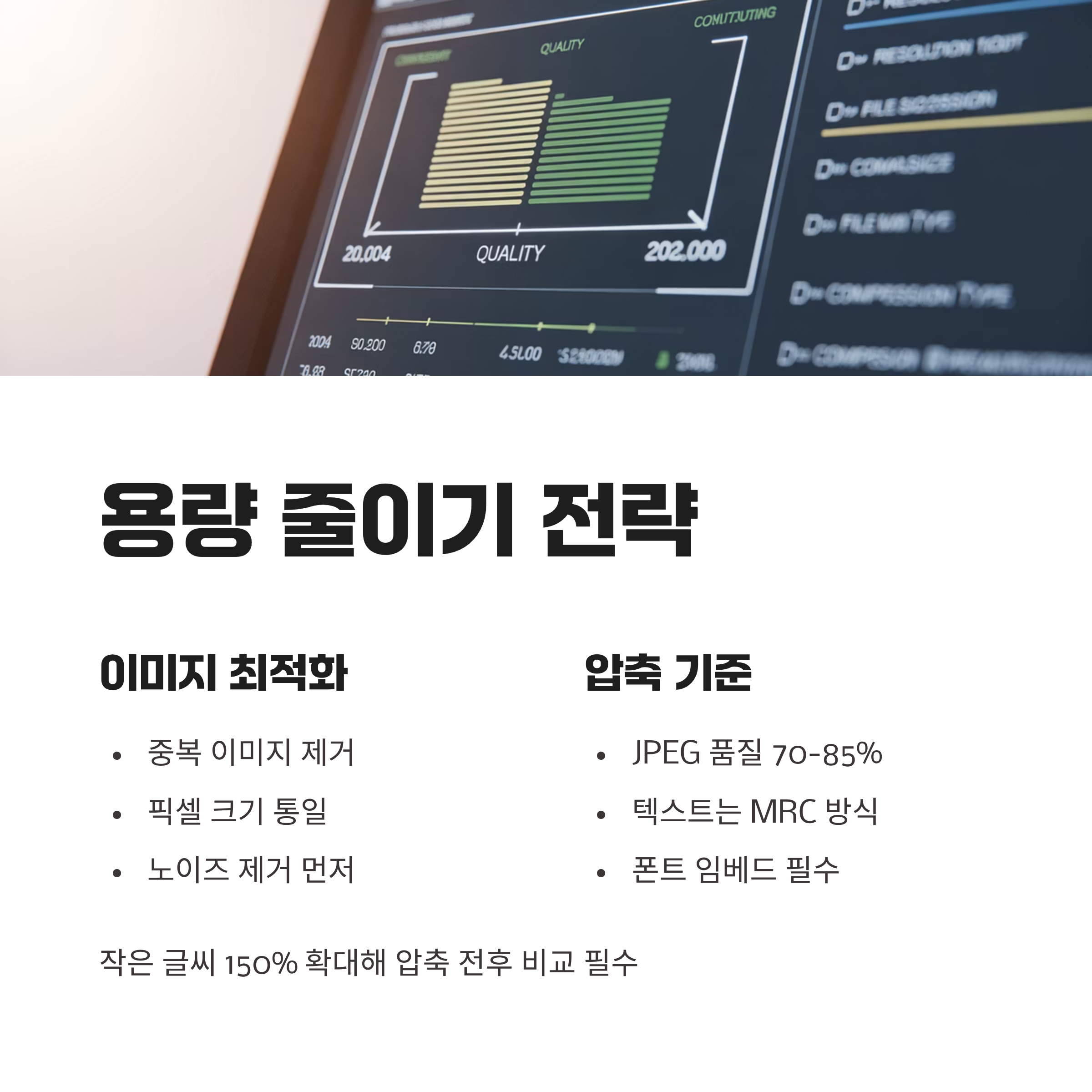 A. 화면용 150dpi, 인쇄용 300dpi로 조건부 압축을 나눠 적용해 보세요.