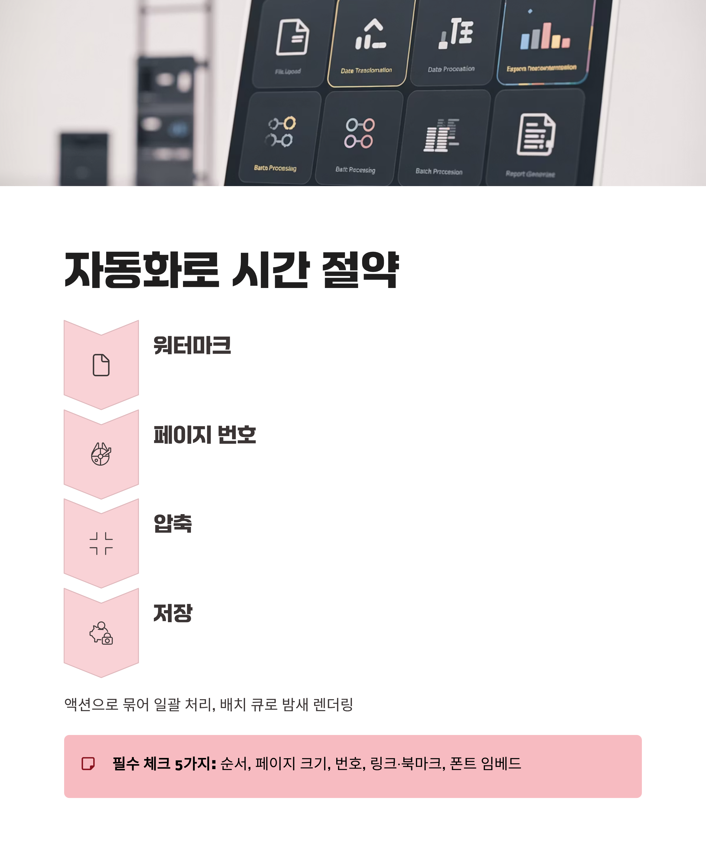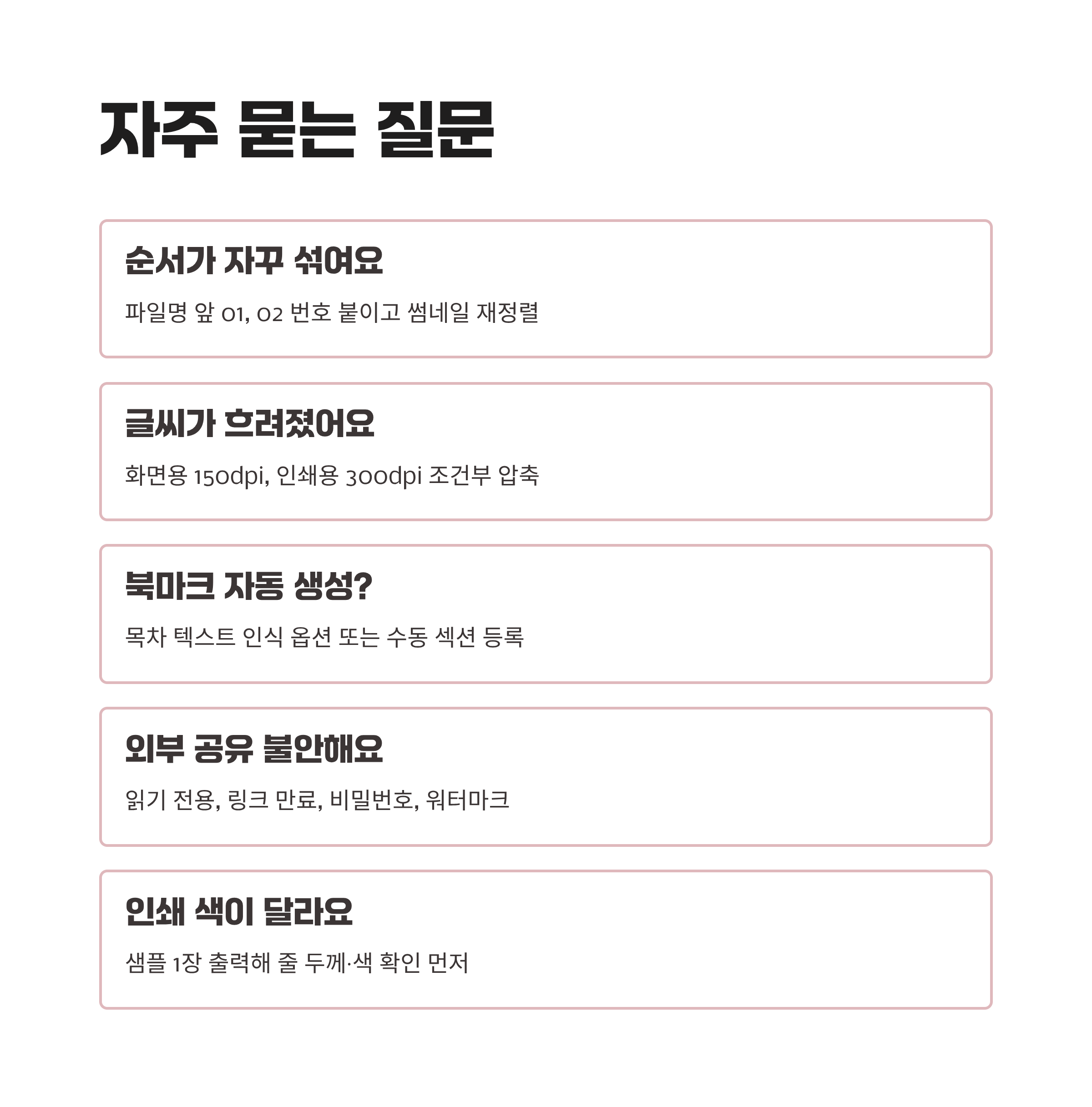 체크리스트는 5개만: 순서, 페이지 크기, 번호, 링크·북마크, 폰트 임베드. 이 다섯 가지만 돌려도 품질이 일정하게 유지돼요. 실패 지점을 기록해 다음 프리셋에 반영하면 루틴이 점점 단단해져요.