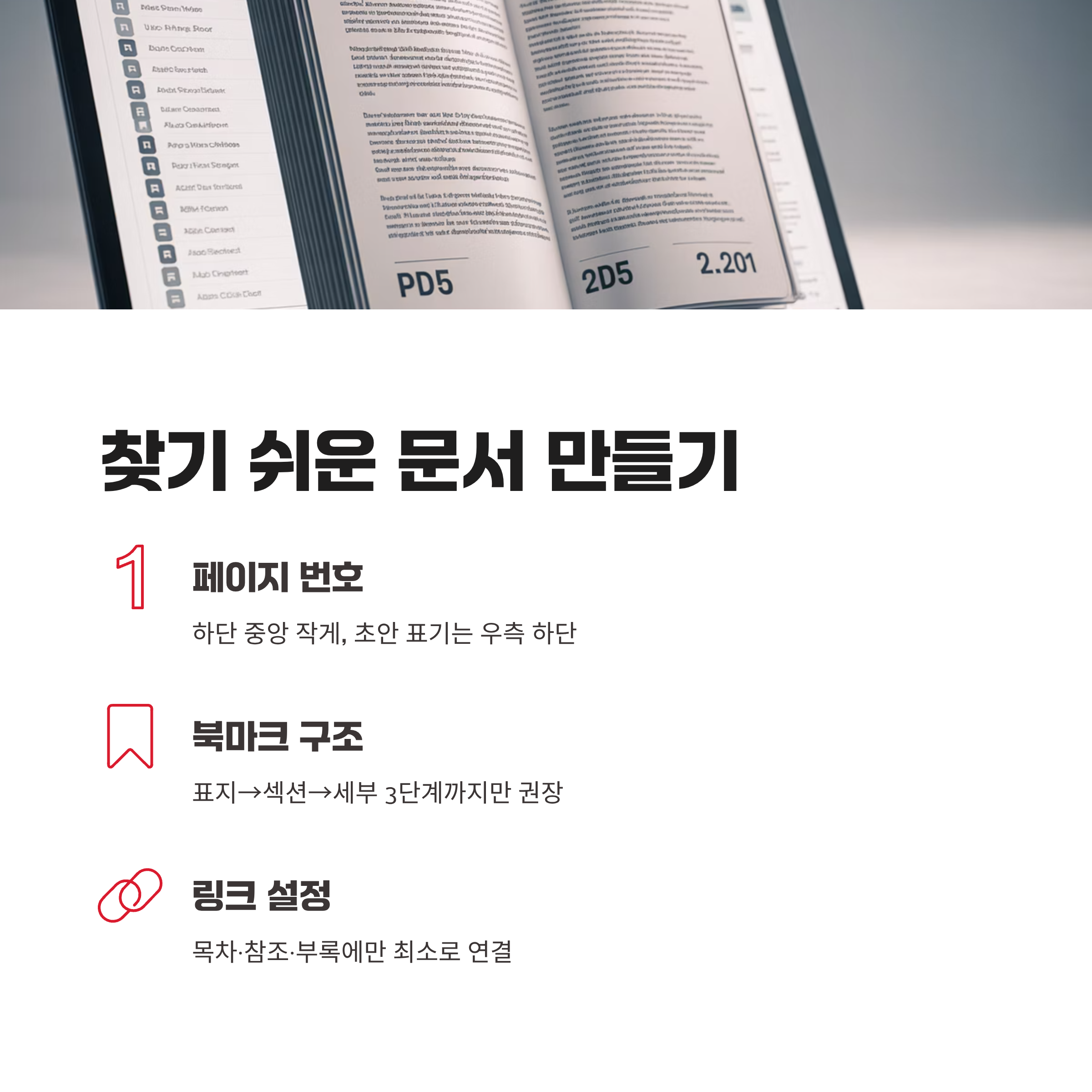 페이지 번호는 하단 중앙에 작게, 초안 표기는 우측 하단에 넣어 혼선을 막아요. 장표 모음이라면 각 섹션 첫 페이지에 소제목 캡션을 달아 훑어보기 속도를 높여요. 표와 그림은 번호 규칙만 통일해도 검토가 편해져요.