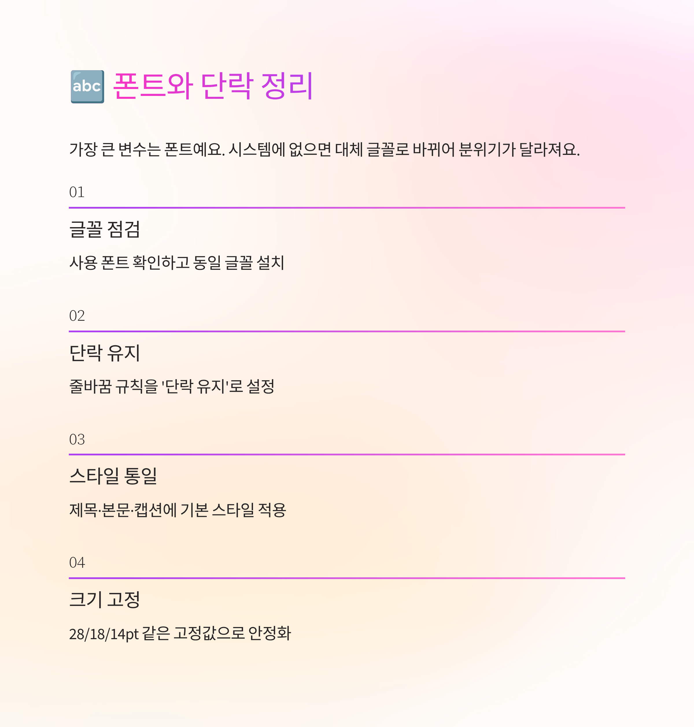 가장 큰 변수는 폰트예요. 시스템에 없는 글꼴이면 대체 글꼴로 바뀌어 분위기가 확 달라져요. 그래서 변환 전 사용 글꼴을 점검하고, 동일 폰트를 설치하거나 유사체를 미리 지정해두면 안전해요. 텍스트가 개별 상자로 쪼개지면 편집이 어려우니, 줄바꿈 규칙을 ‘단락 유지’로 가져오는 옵션을 우선으로 고르세요.