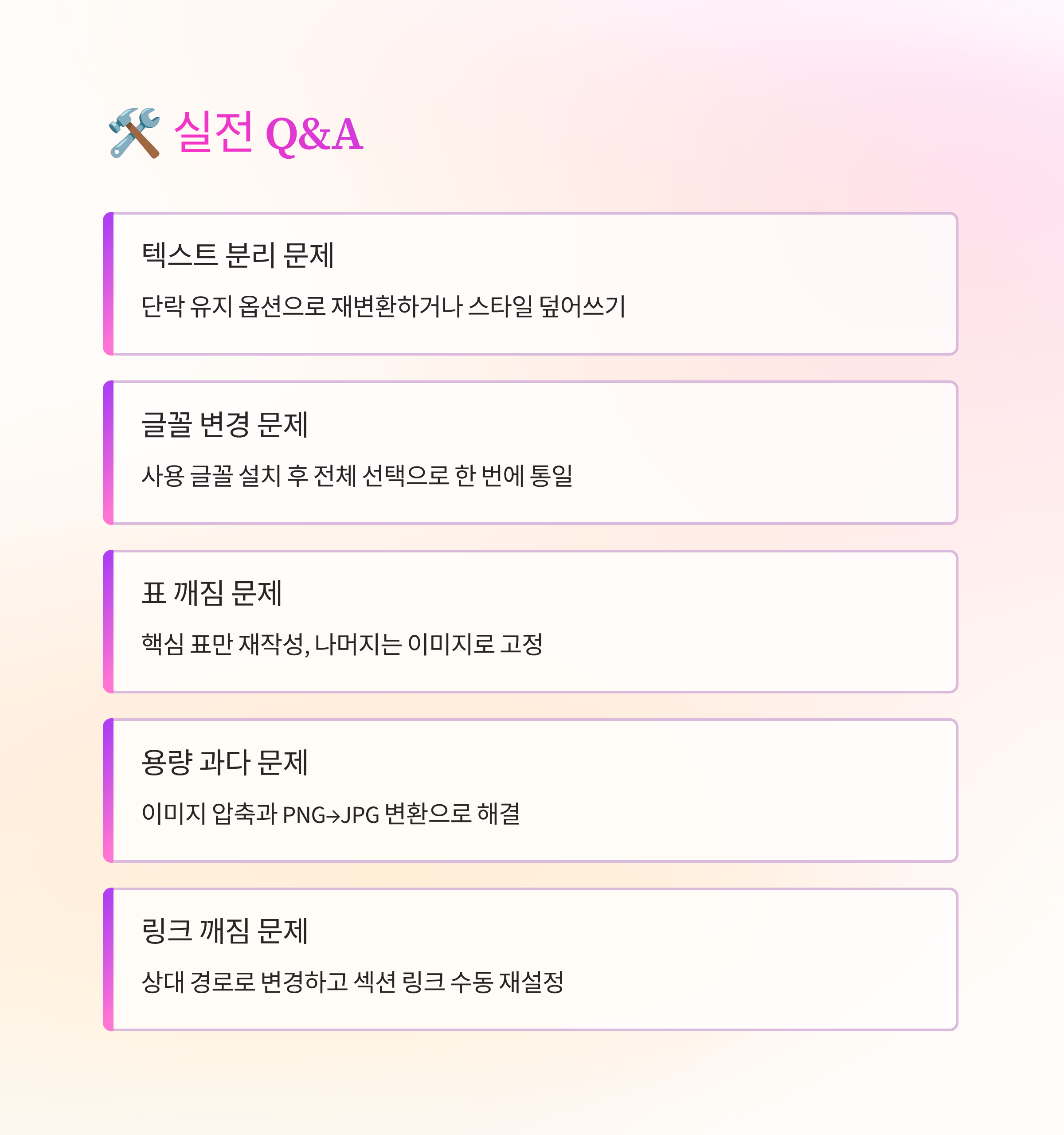 페이지가 많은 문서는 절반만 먼저 변환해 품질을 확인하세요. 시간과 용량을 아끼고, 문제 패턴을 초기에 발견할 수 있어요. 실패 사례를 템플릿에 메모해두면 다음 변환 때 같은 실수를 반복하지 않아요.