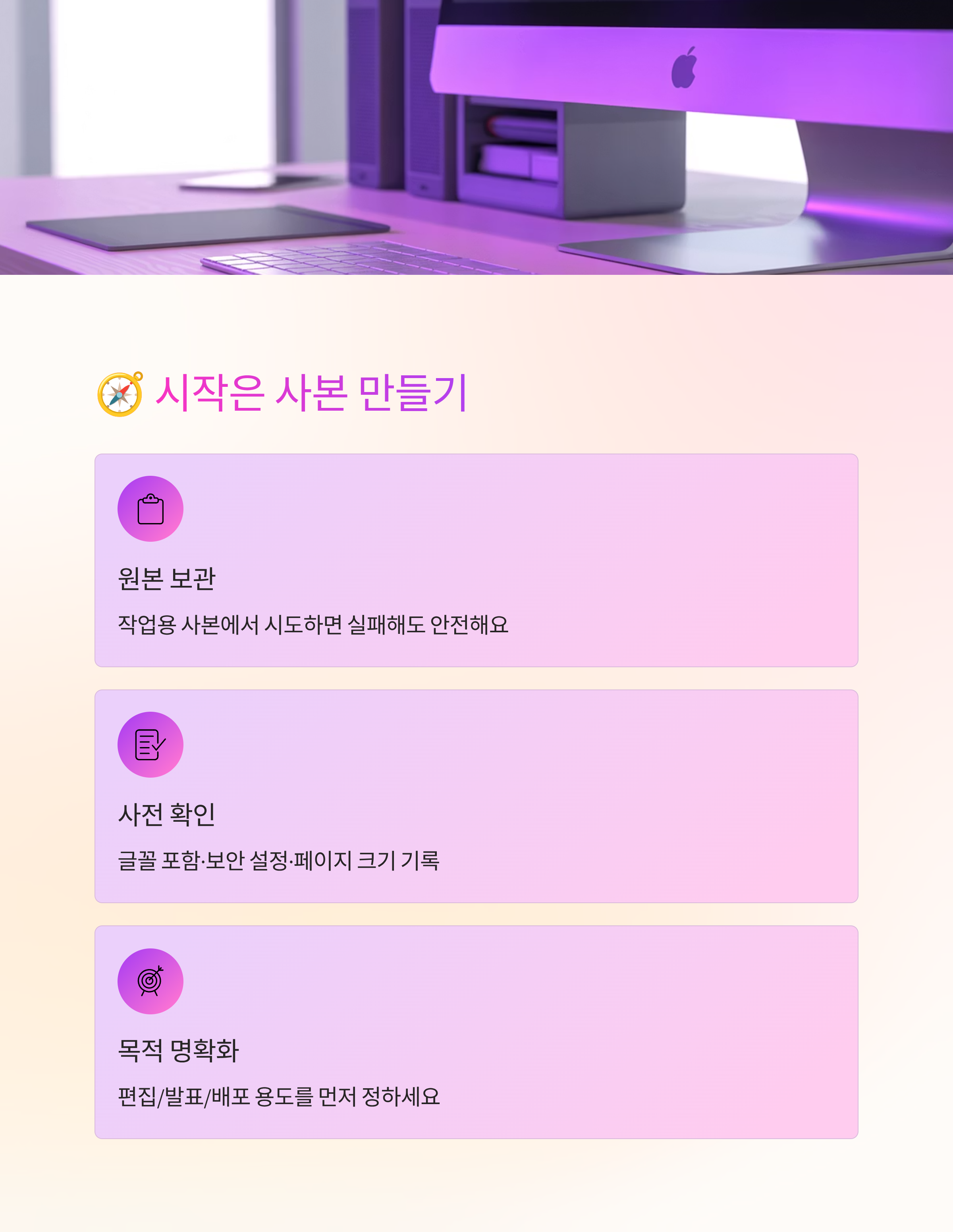 첫 단계는 파일 복제예요. 원본 PDF는 그대로 두고 작업용 사본에서 시도하면 실패해도 마음이 편해요. 가능한 경우 글꼴 포함 여부와 보안 설정을 먼저 확인하고, 페이지 크기(특히 4:3/16:9)를 기록해두면 후반 조정이 쉬워요. 작은 습관 하나로 변환 품질이 확 달라지더라고요. 이때 체크리스트 맨 위에 PDFPPT변환 목적(편집/발표/배포)을 적어두면 선택이 흔들리지 않아요.