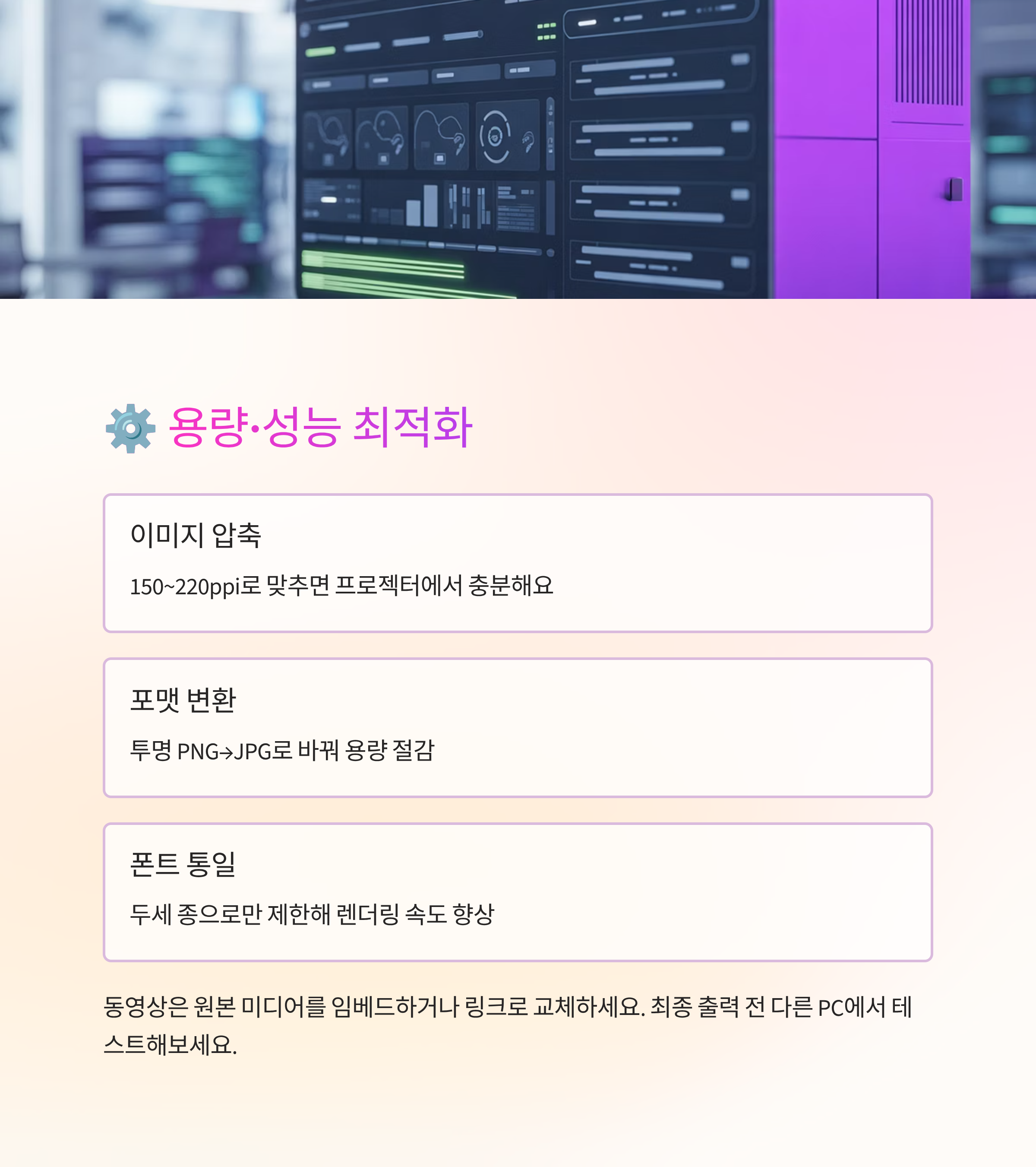 이미지 용량이 커지면 슬라이드 전환이 버벅여요. 삽입 후 ‘그림 압축’에서 해상도를 150~220ppi로 맞추면 회의실 프로젝터에서 충분해요. 투명 PNG는 합성 비용이 커서, 배경이 필요 없으면 JPG로 바꿔 용량을 줄여보세요. 폰트는 두세 종으로만 통일하면 파일 크기와 렌더링 속도가 함께 좋아져요.