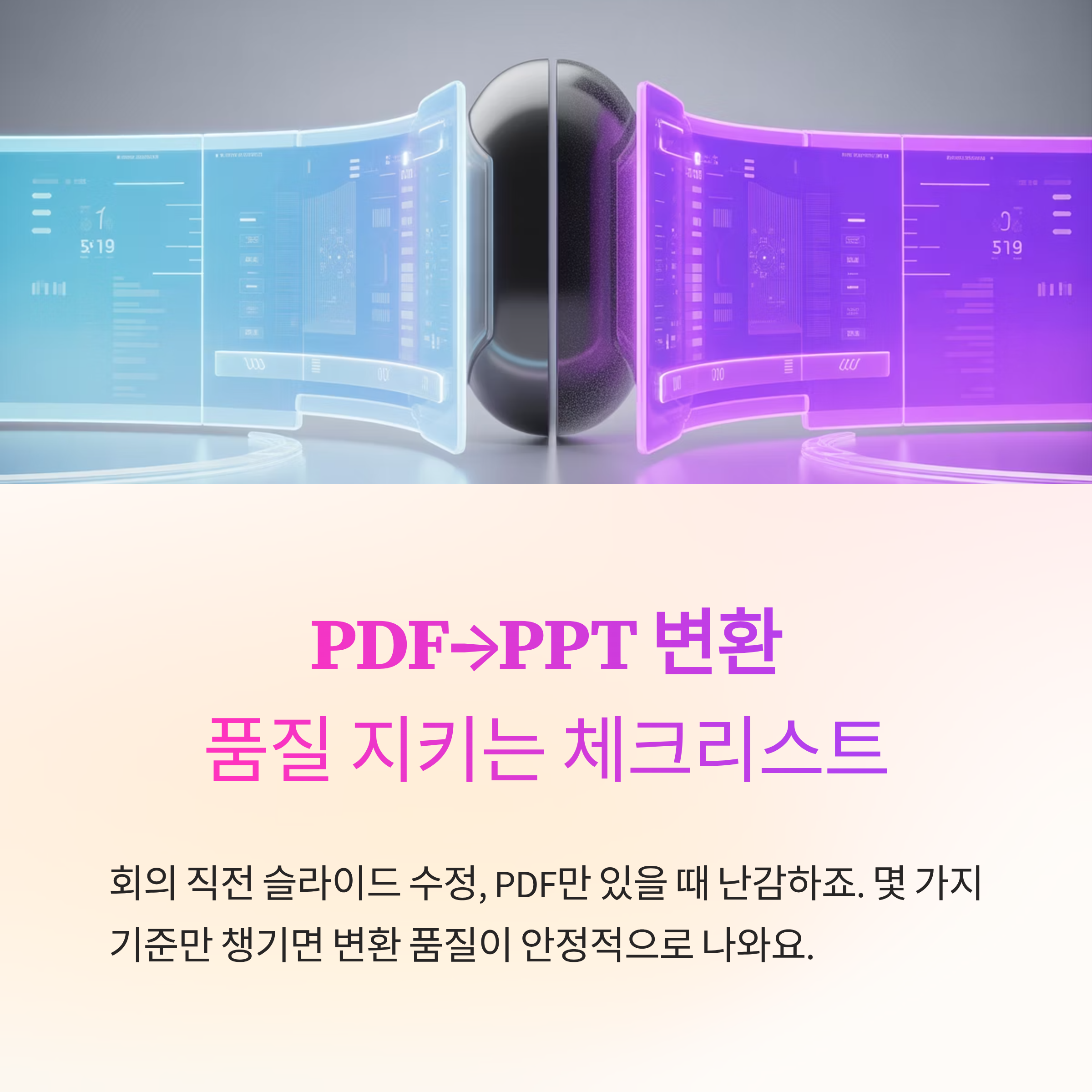 회의 직전에 슬라이드만 조금 손보면 끝인데, 원본은 없고 PDF만 있을 때 난감할 때가 많죠. 서둘러 변환했더니 글꼴이 바뀌고 줄바꿈이 흔들려서 다시 손대느라 시간이 배로 들곤 해요. 사실 몇 가지 기준만 챙기면 변환 품질이 꽤 안정적으로 나오더라고요. 폰트 포함 여부, 이미지 추출 방식, 표와 링크 보존만 제대로 확인해도 시행착오가 확 줄어요. 오늘은 무료·기본 툴로 가볍게 시작해도 실무에서 바로 쓸 수 있는 변환 흐름을 차근차근 정리해볼게요.