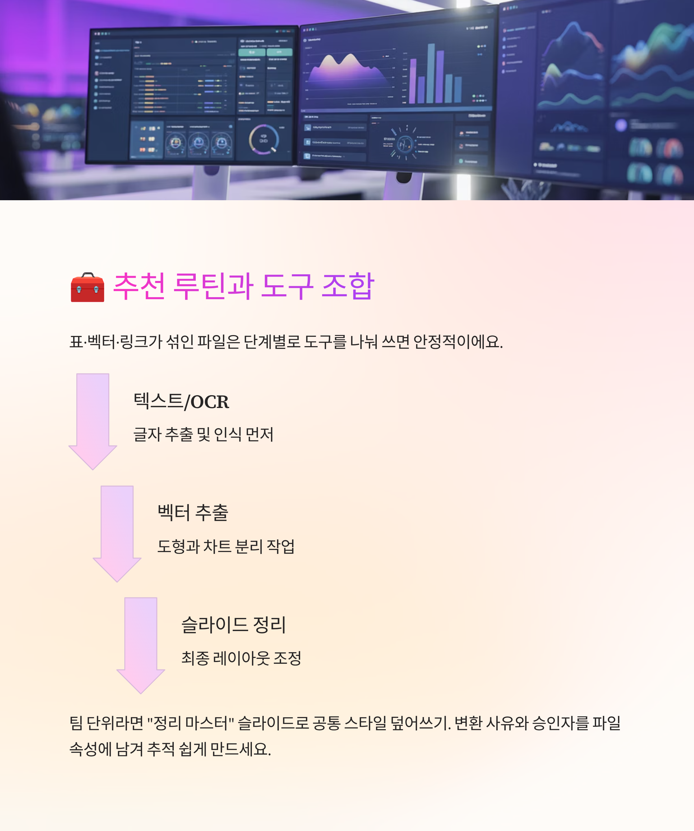 이미지 위주 문서라면 OCR을 먼저 걸어 텍스트를 살려두세요. 슬라이드에 복사해도 글자가 깨지지 않아 수정이 편해요. 표가 많은 문서는 벡터 유지 옵션을 켜고, 불가하면 고해상도 이미지로 가져온 뒤 나중에 표로 다시 그리면 전체 인상이 깔끔해요.