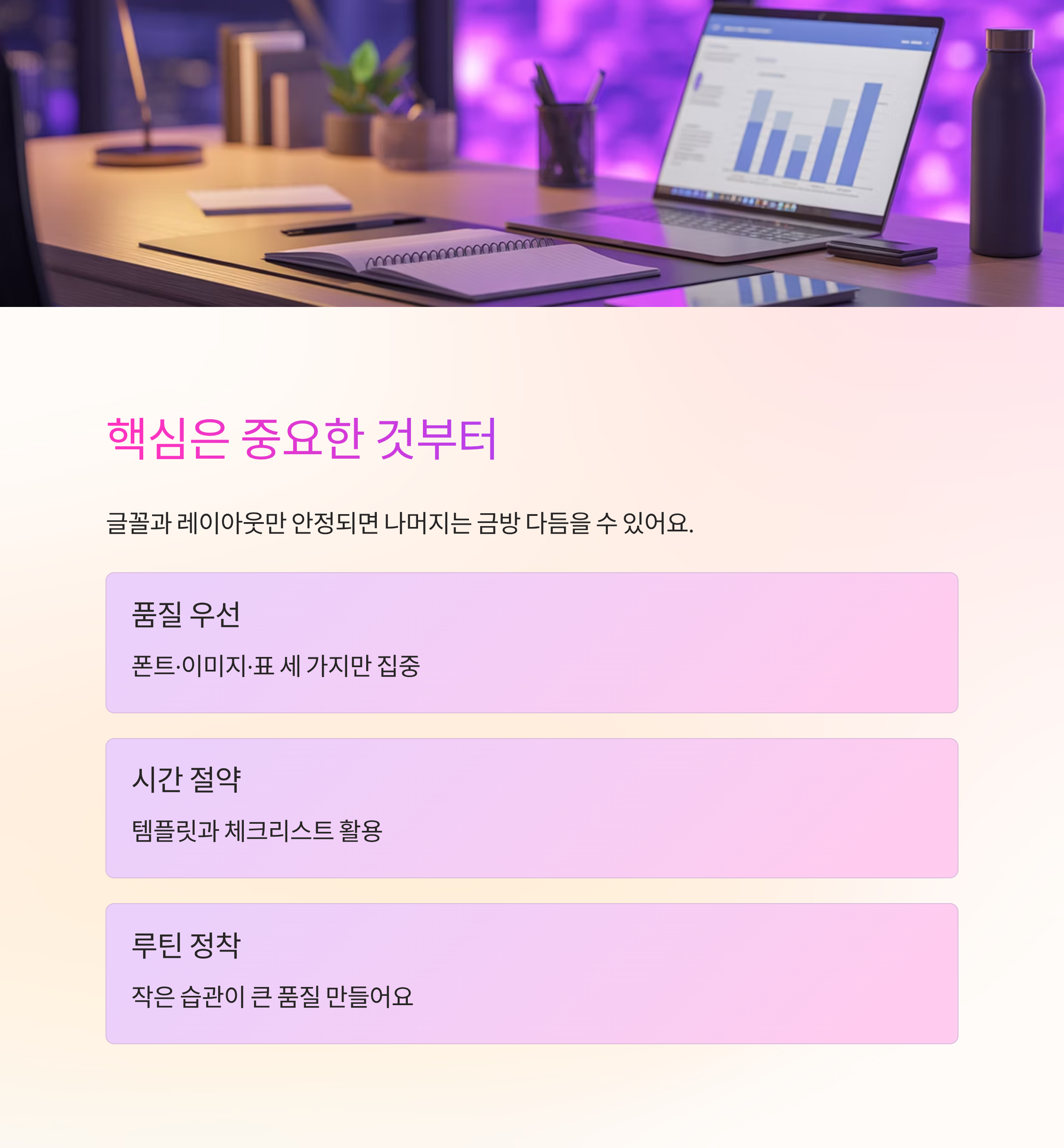 결국 핵심은 욕심내지 않고 중요한 것부터 살리는 거예요. 글꼴과 레이아웃만 안정되면 나머지는 손으로 금방 다듬을 수 있거든요. 오늘 정리한 흐름대로만 해도 변환본이 훨씬 단정해지고, 발표 준비 시간이 눈에 띄게 줄어요. 다음번엔 템플릿을 바로 열고 체크리스트부터 지워보세요. 작은 루틴이 큰 품질을 만들어줘요.