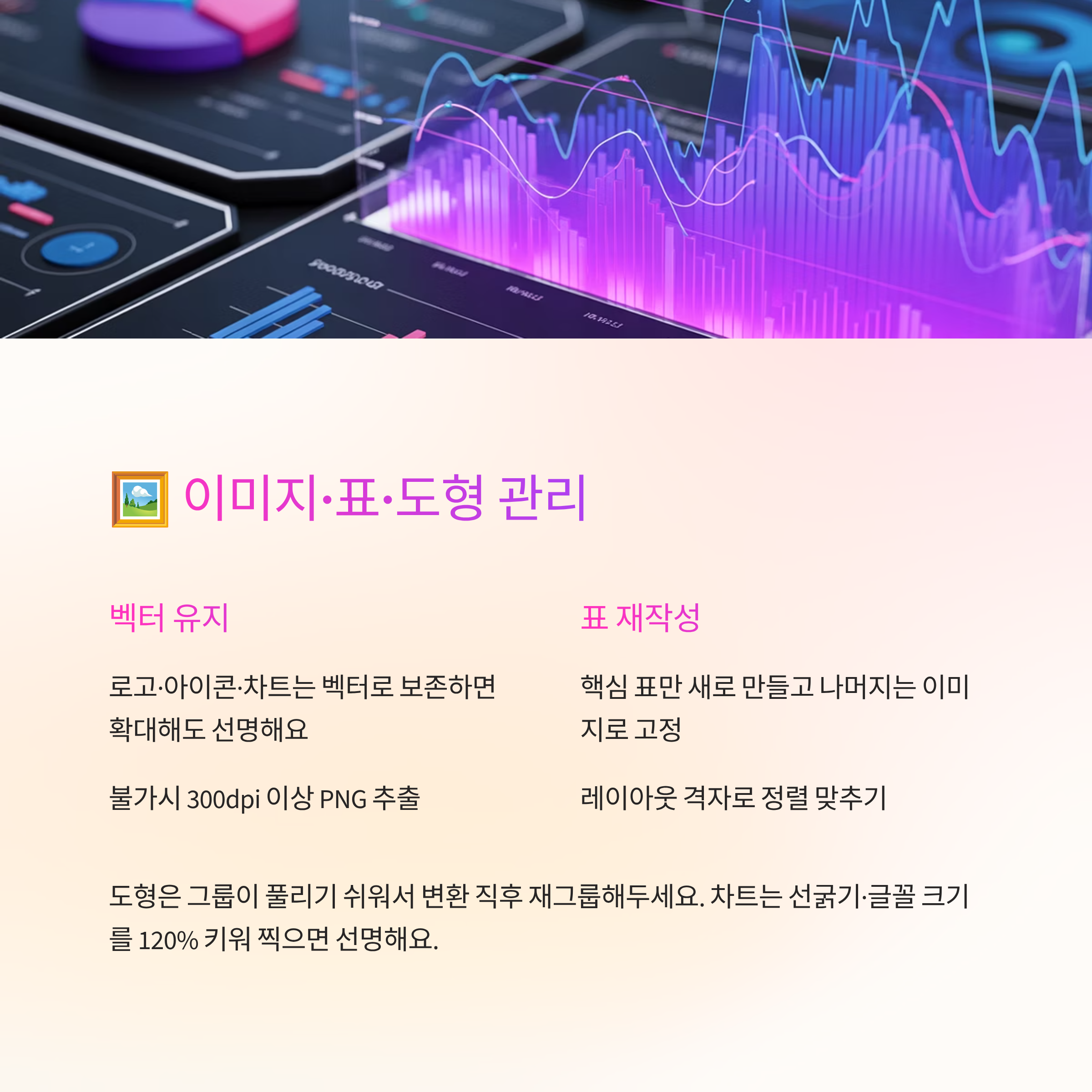 표는 셀 구조가 무너질 가능성이 높아요. 핵심 표만 새로 만들고, 나머지는 이미지로 고정해 혼용하면 시간이 줄어요. 이때 레이아웃 격자를 켜고 정렬을 맞추면 보기 품질이 확 달라져요. 도형은 그룹이 풀리기 쉬워서, 변환 직후 동일 요소끼리 재그룹해두면 편집이 수월해요. 이런 정리만으로도 변환본이 한층 단정해져요.