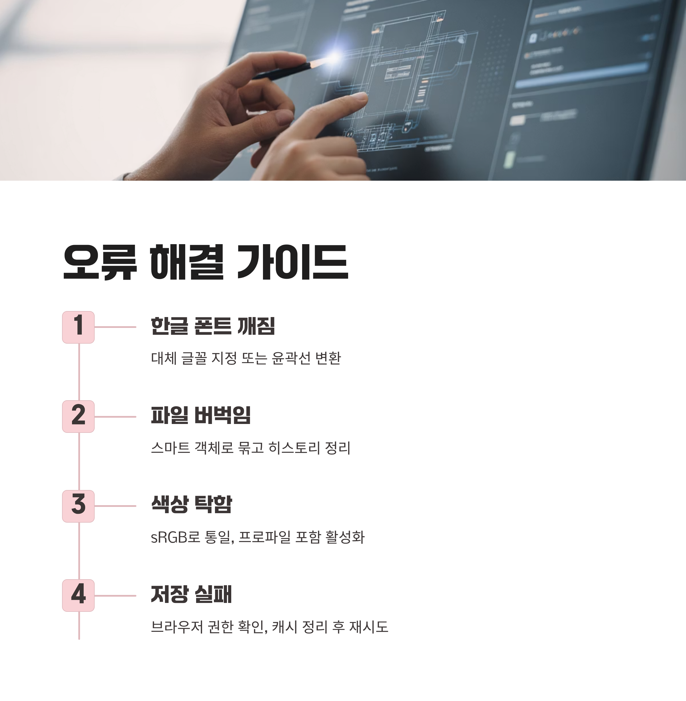 한글 폰트가 깨지면 웹 폰트 로드 문제일 때가 많아요. 대체 글꼴을 지정하거나, 텍스트를 윤곽선으로 잠깐 변환해요. 큰 파일이 버벅이면 레이어를 스마트 객체로 묶고, 필요 없는 히스토리를 정리하면 확 가벼워져요.