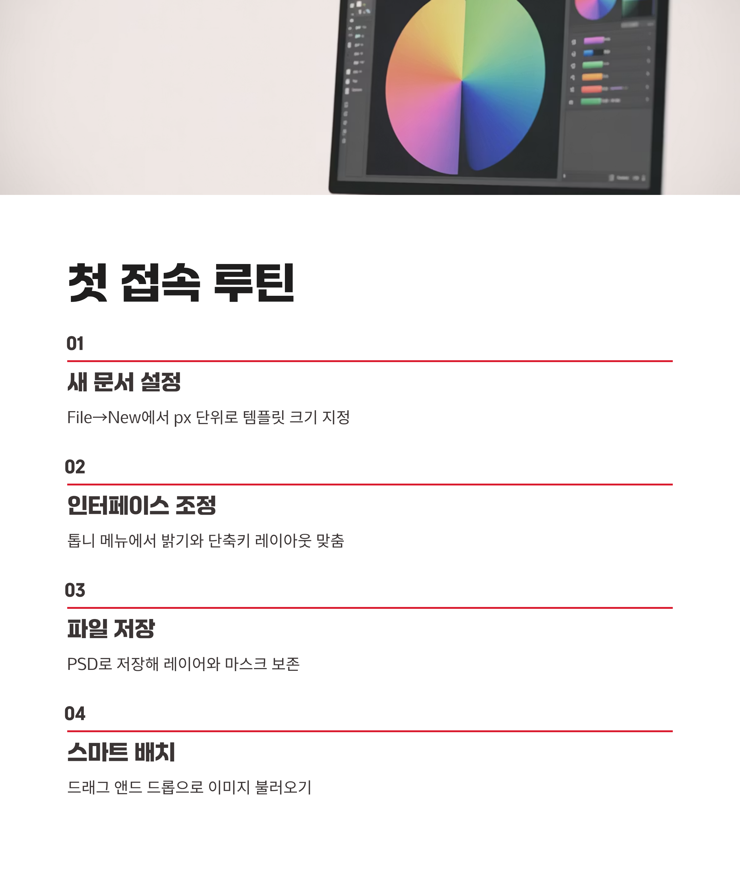 이미지 불러오기는 드래그 앤드 드롭이 가장 빠르고, 스마트 객체로 배치하면 품질 유지에 유리해요. 캔버스 크기와 아트보드는 미리 정해두고, 가이드와 격자를 켜서 정렬 기준을 단단히 잡아두면 이후 작업이 한결 깔끔해져요.
