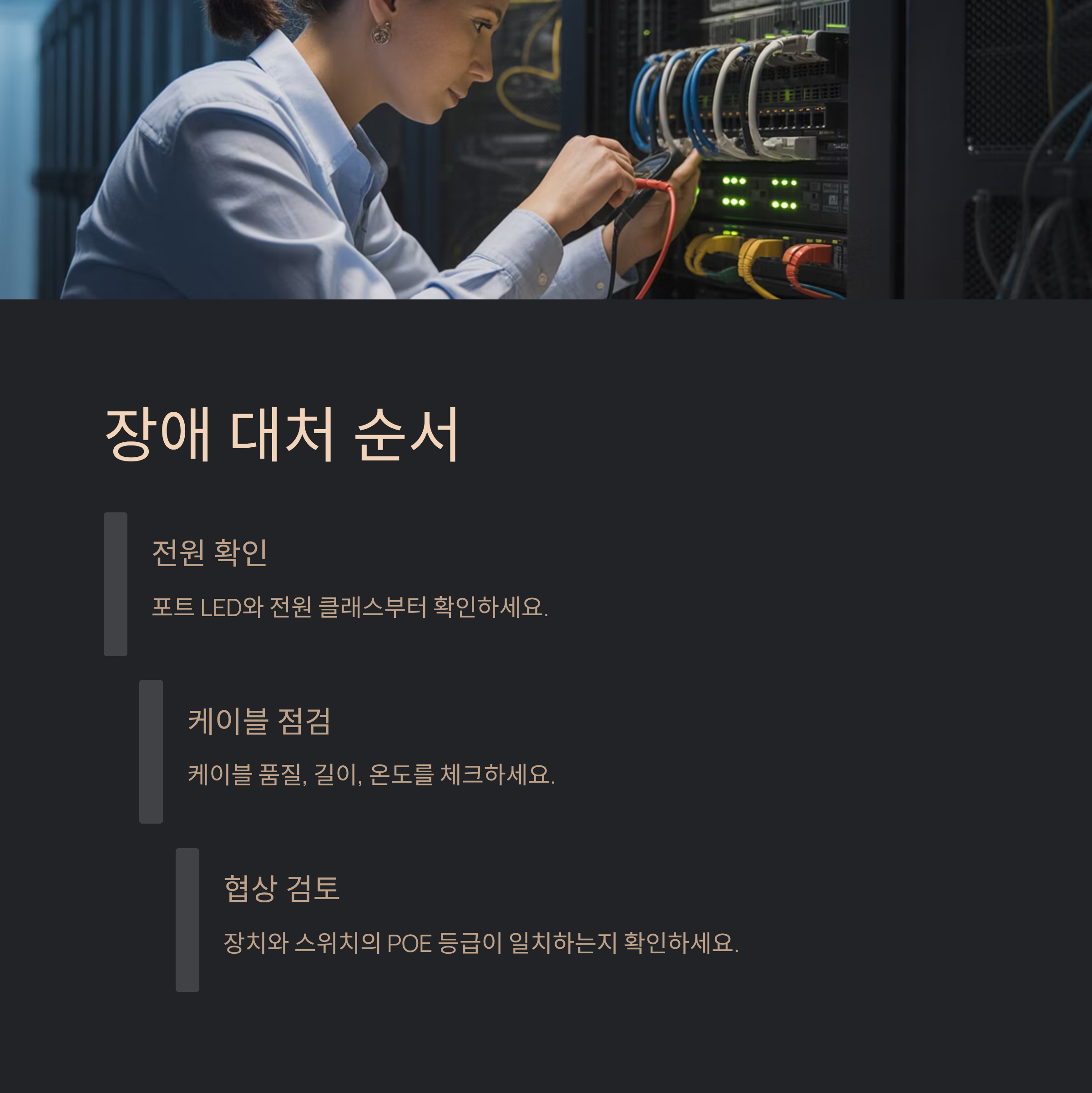 장치가 안 켜지면 먼저 포트 LED와 전원 클래스를 봐요. LED가 아예 안 들어오면 케이블·핀 배열·단선 문제일 확률이 높아요. 다른 포트에 꽂아보거나, 패치 케이블을 교체해요. LED가 켜졌다 바로 꺼지면 과전류 보호나 협상 실패일 가능성이 커요. 장치 스펙의 PoE 등급과 스위치 포트 등급이 일치하는지, 중간에 패시브 인젝터가 끼어 있지 않은지 확인해요. 인라인 테스터로 전압이 실제로 몇 볼트까지 올라오는지 체크하면 원인이 금방 좁혀져요.