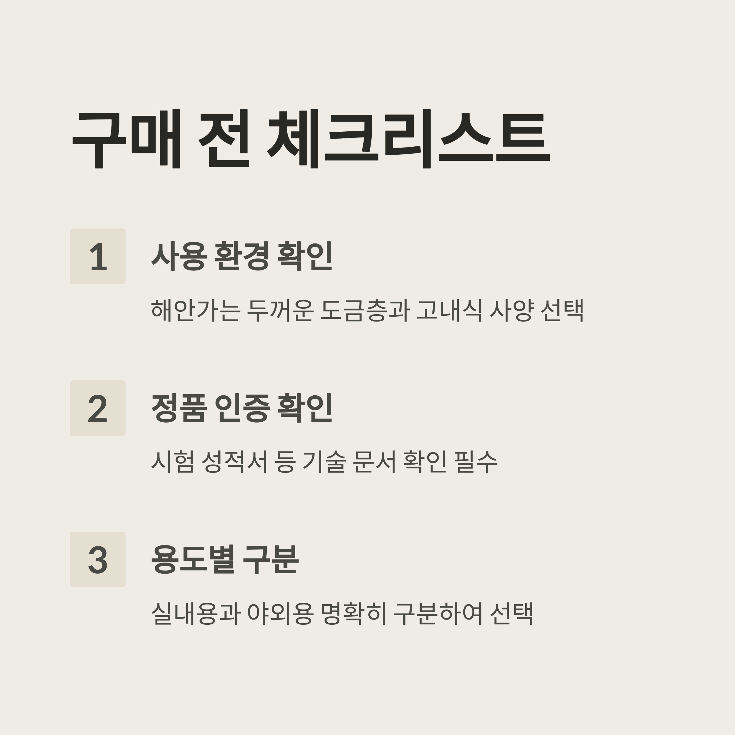 특히 해안 지역처럼 부식 위험이 큰 장소에서는 보다 두꺼운 도금층과 고내식 사양을 선택하는 게 일반적이에요. 실내용과 야외용을 명확히 구분하고 예산 대비 효과를 종합적으로 따져보는 것이 중요하겠죠.