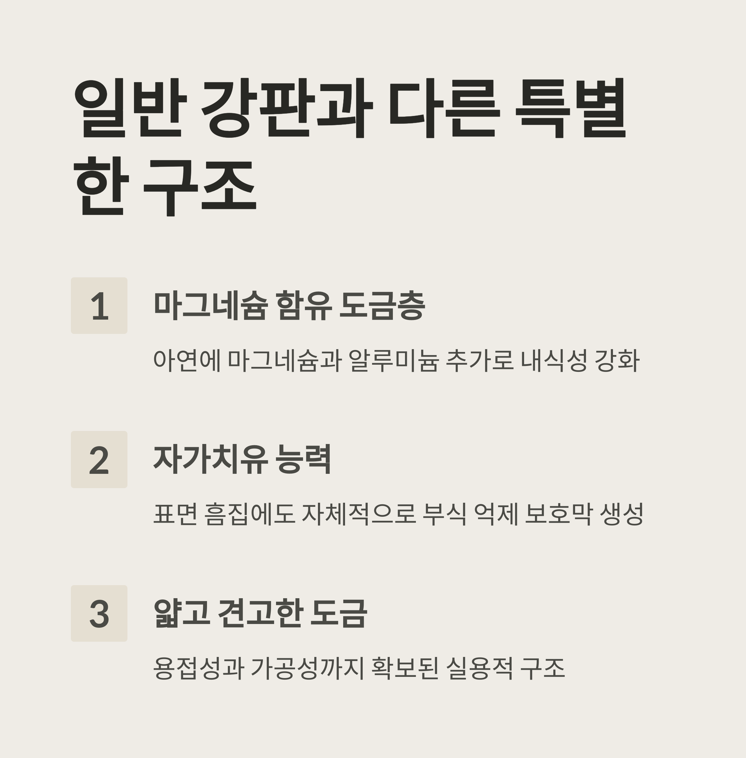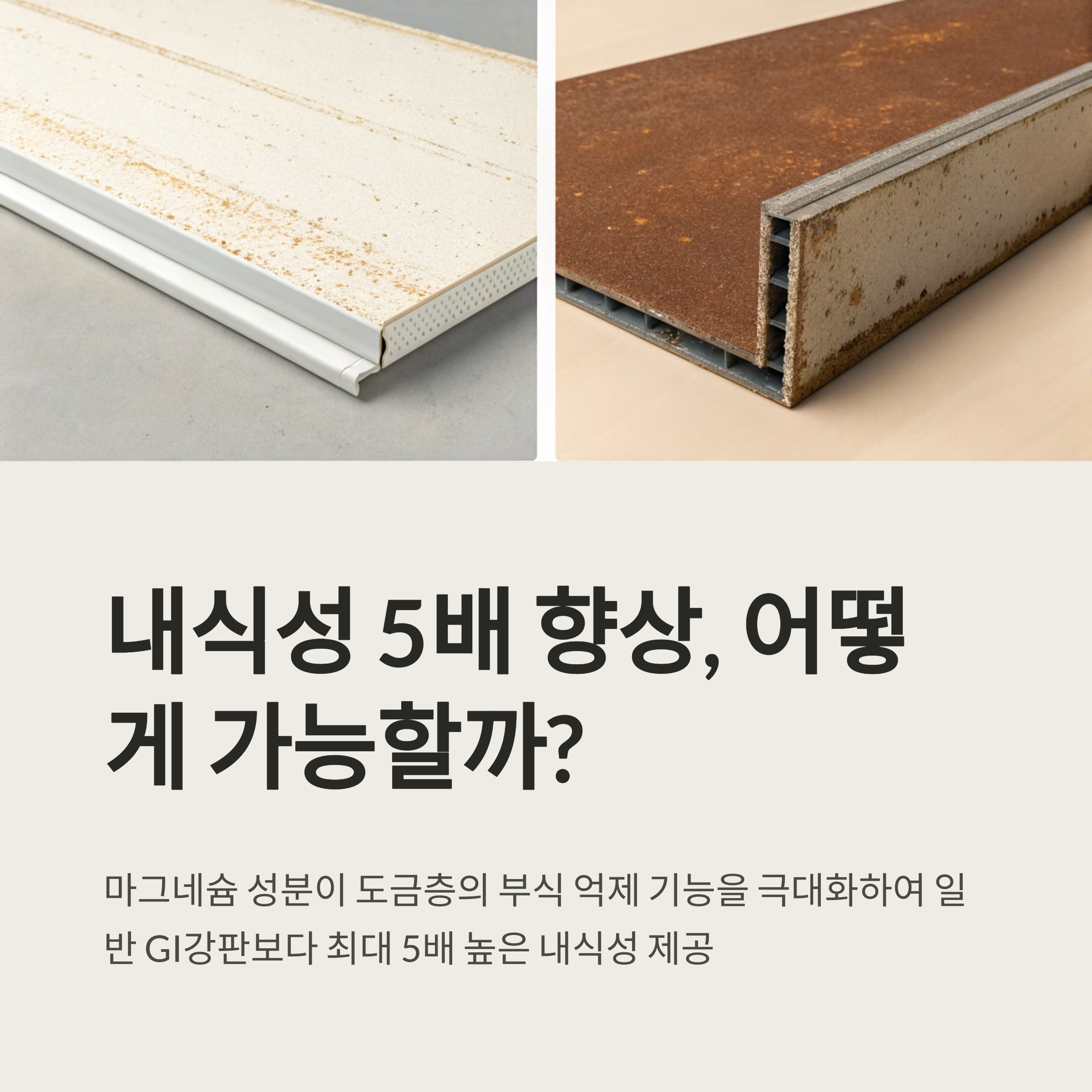 기존의 GI강판과 비교했을 때 가장 큰 차이는 '도금층의 성질'에 있어요. GI강판은 도금층이 두껍고 부드러운 편이라 외부 충격에 상대적으로 취약하죠. 하지만 마그네슘이 포함된 도금강판은 도금층 자체에 자가치유 성능이 어느 정도 있어요.
